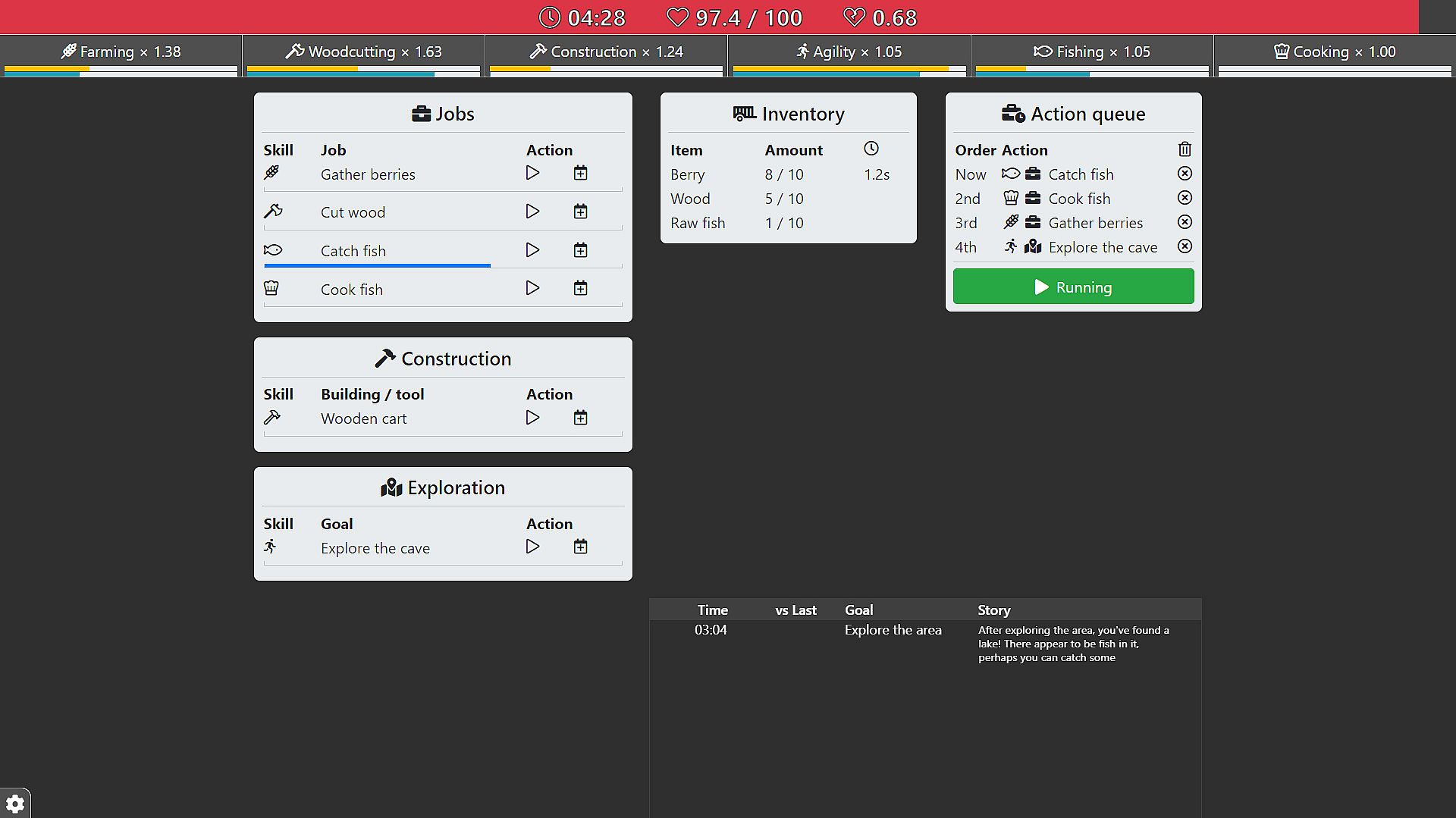 Every action uses one of many skills, such as Farming of Woodcutting. Every skill has two leveling types, Generation levels and Instinct levels. Generation levels increase more rapidly and provide a bigger benefit throughout life. Instinct levels increase at a slower pace, but persist through death, creating a permanent improvement for every following life. The combined effect of these levels directly affects how quickly you can perform actions that use these skills, allowing you to spend more of your time on other actions to increase your chances to survive!Story based progression
