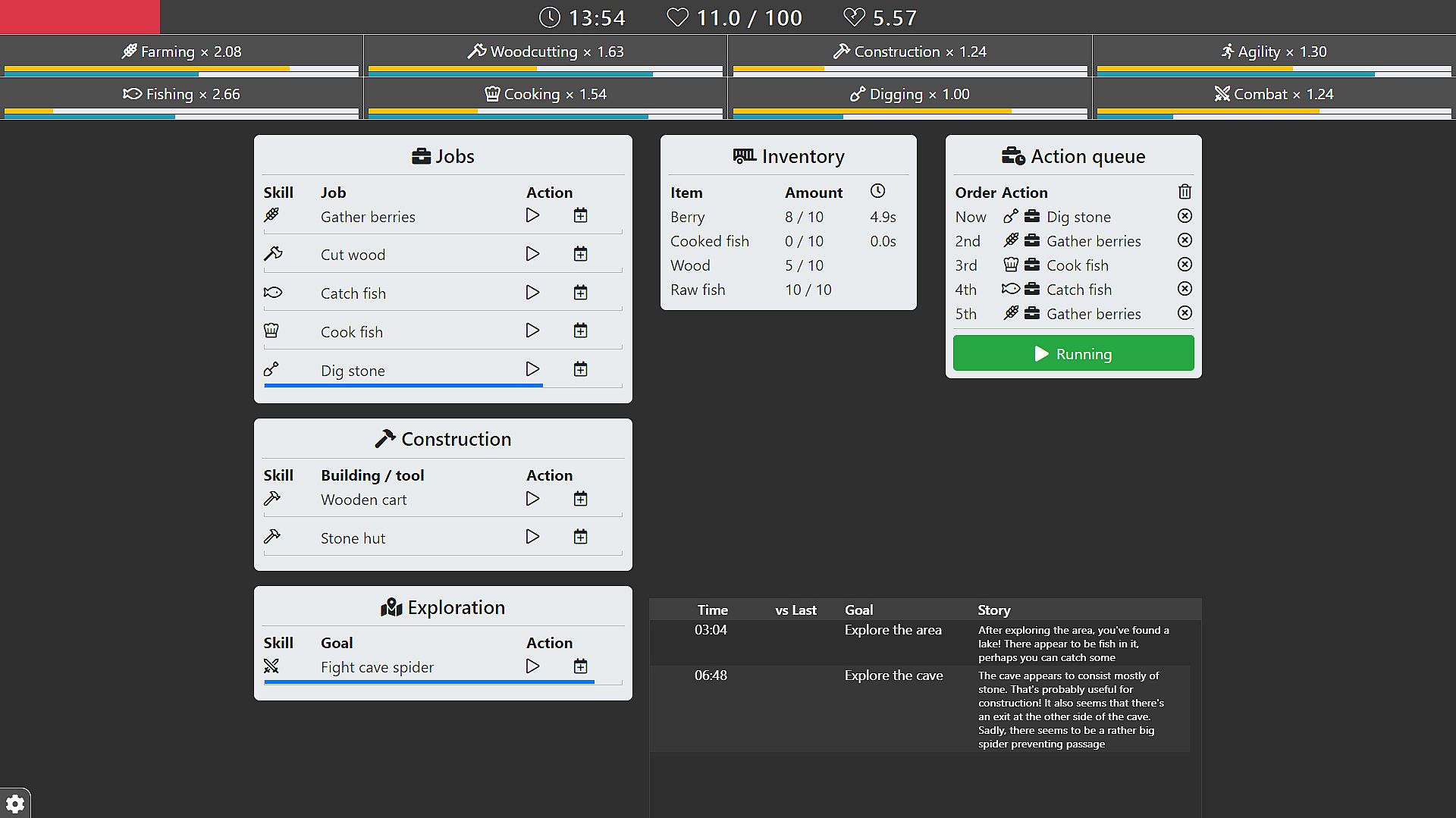 Throughout life, you'll have access to various jobs, constructions and explorations. Using the step-by-step queue system, you can plan exactly what you want to happen and the game will automatically follow your orders. When your queue is empty, the game pauses automatically, so you don't lose any of your precious time! This is a game about planning and strategizing, not a game about micro-management or clicking. However, if you prefer to play more real-time, you can prioritize anything over your queue at any time.Skills