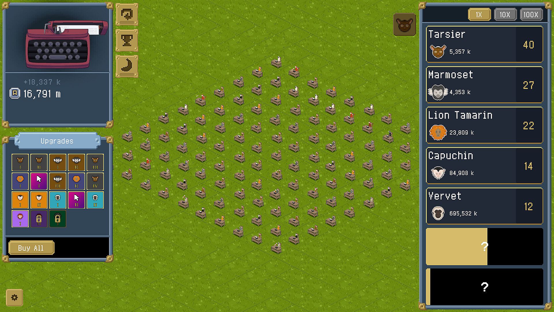 Upgrade and expand your operation by hiring more skilled monkeys and improving their tools. Watch your typewriters clack endlessly as your monkeys strive to produce meaning from madness.