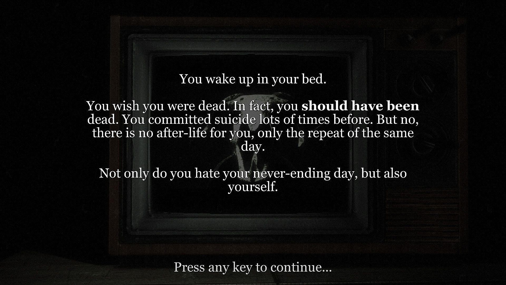 Madness in Infinite Loop is a story about a man who is doomed to wake up to the same morning, no matter what he does. You want to die, but you wake up in your bed each time you die. When nothing you do matters, can you keep your sanity and morals?