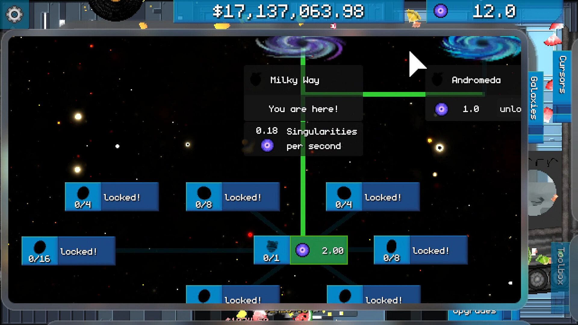 Incremental fruit slicing, but the knife is on a rope. Upgrade your fruit factories to slice fruit into smaller and smaller pieces to maximize profit.