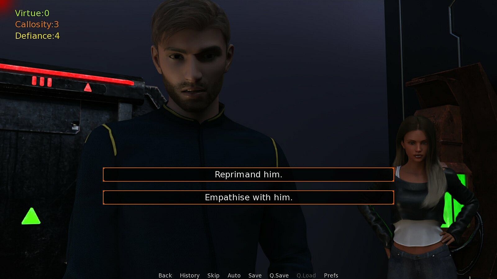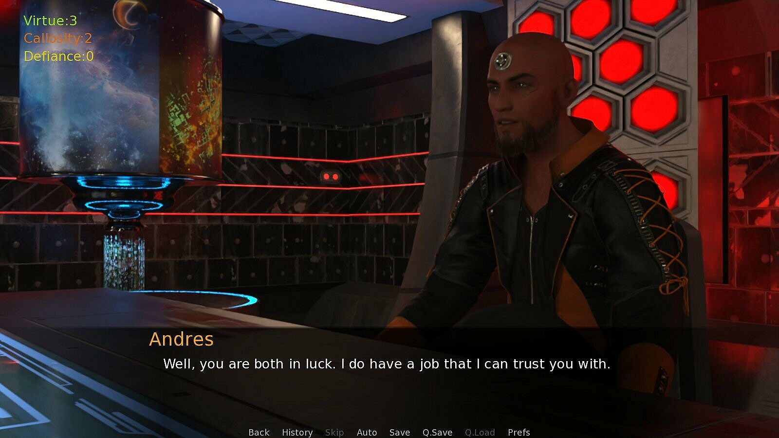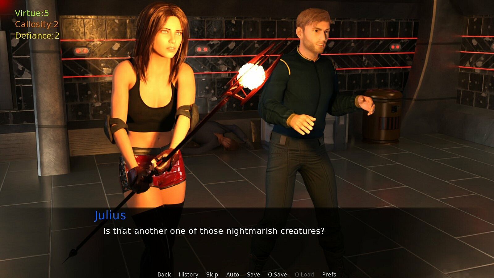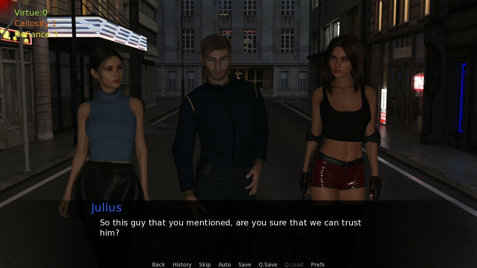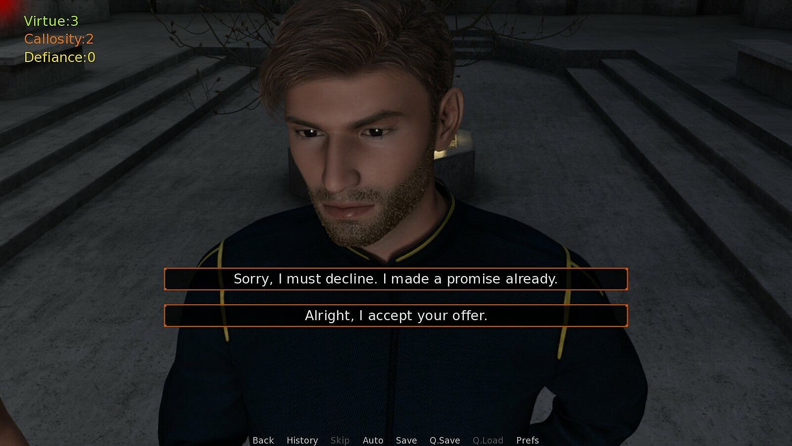 • Three attributes: Virtue, Callosity, and Defiance. How we act will cause different attributes to increase, which in turn can unlock some dialogue options and even entire game endings.