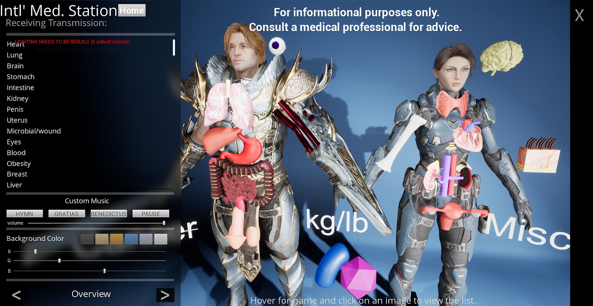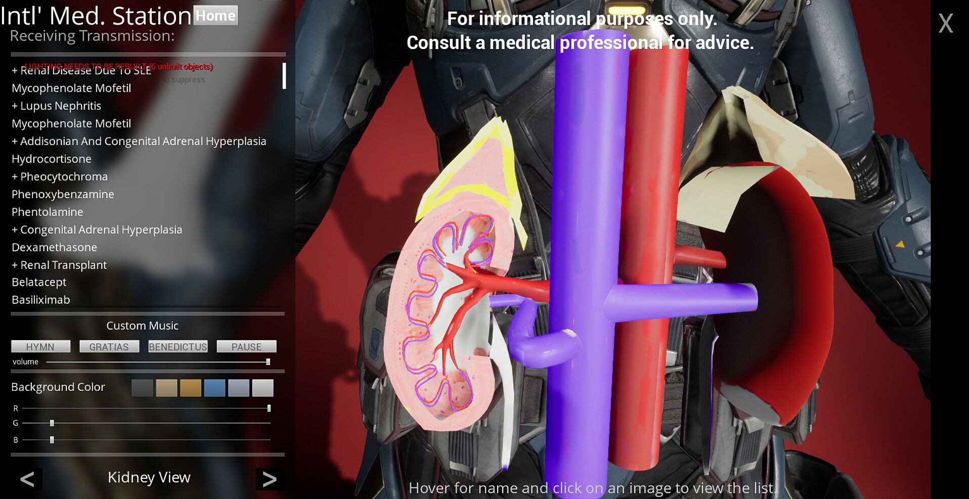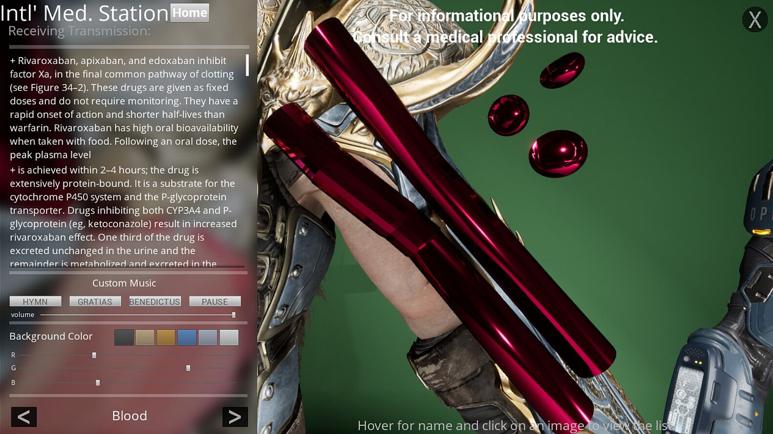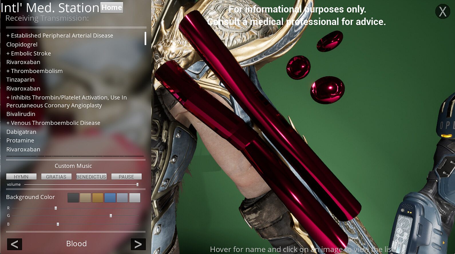 As a sequel to the applications made by Planet Muses, International Medical Station provides information about drugs corresponding to the diseases. As you click through the organs or letters, diseases and assorted drugs appear on the left side of the screen. As you click on a drug, information about the drug appears. Cycle through all parts or parts of interest to find the drugs related to each part!