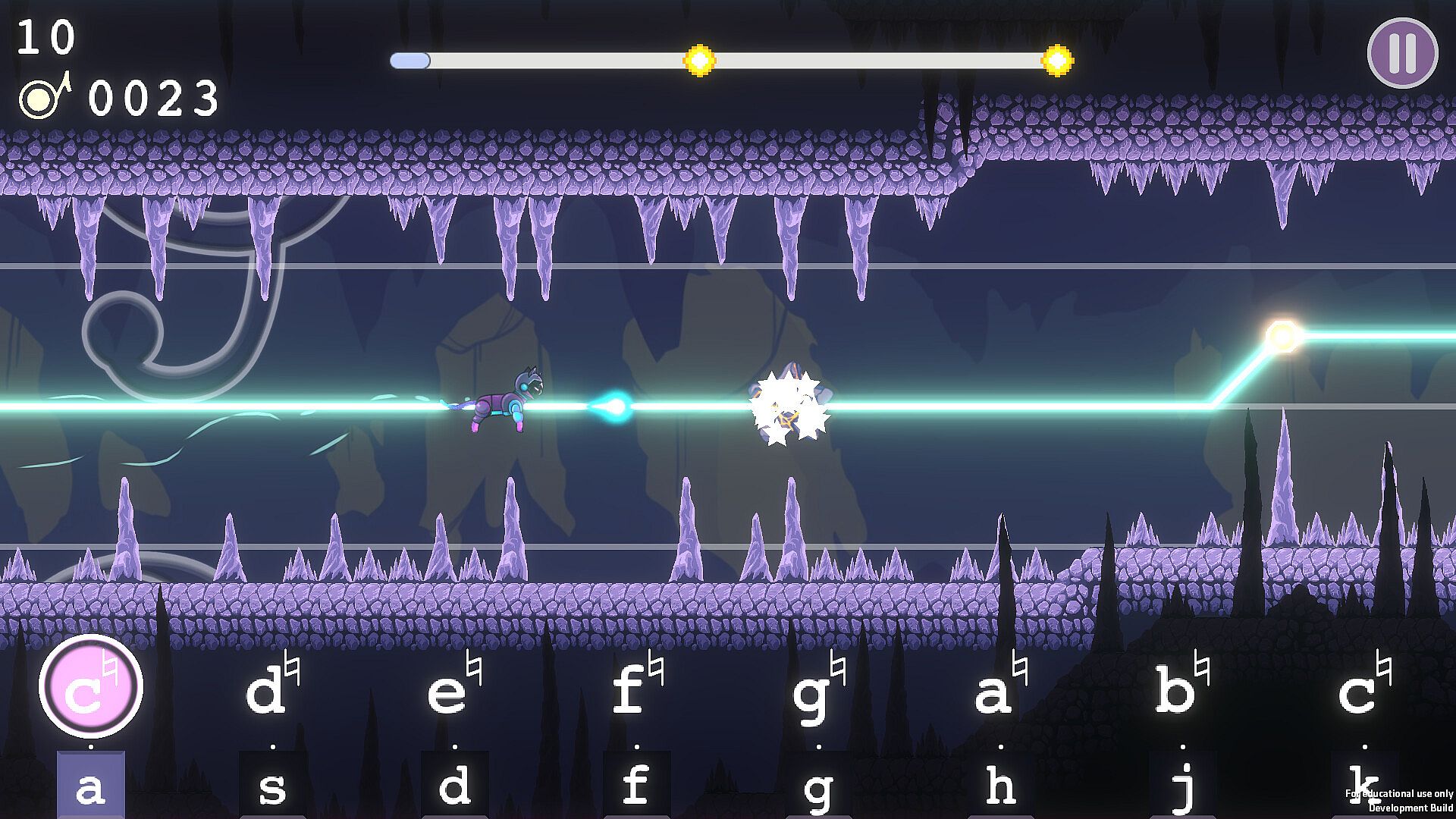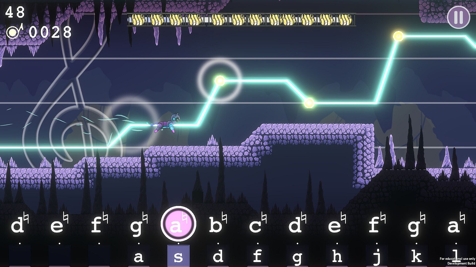 In this 2D side scroller, each note that you play moves the cat up and down on the screen based on the musical intervals that you play (Intervallic!). Objects are arranged so that by the end of each level as you collect notes and dodge obstacles you have played a full song. Collect notes in each phrase to unlock each record and collect all of the records to beat the level.