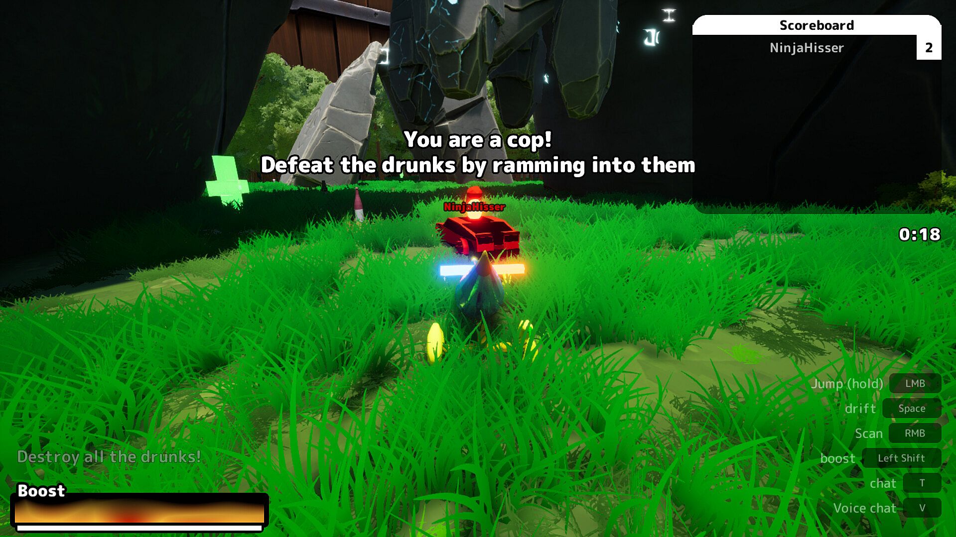 Coordinate with your team to capture the opponents flag, but beware, the longer the flag is held, the more drunk you become.