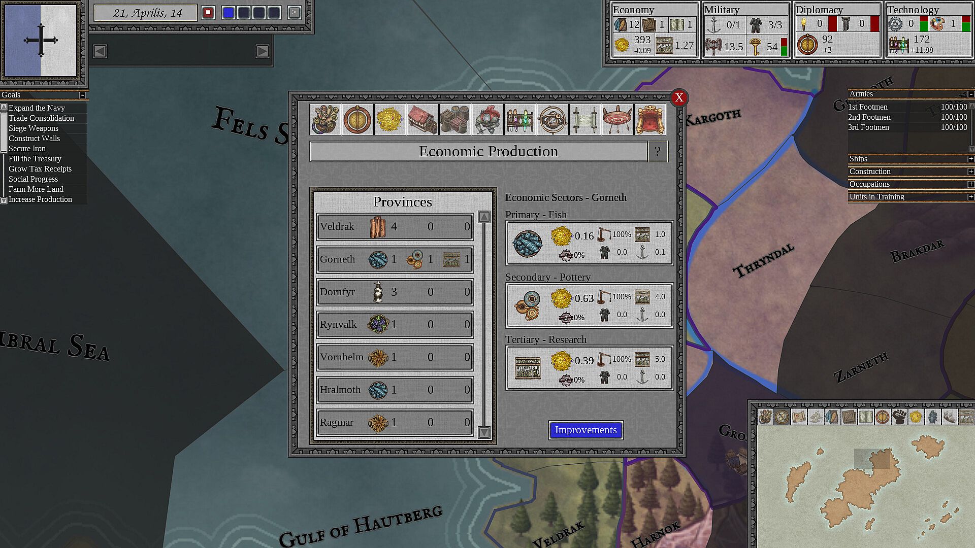Primary, secondary, and tertiary economic sectors with chaining bonuses