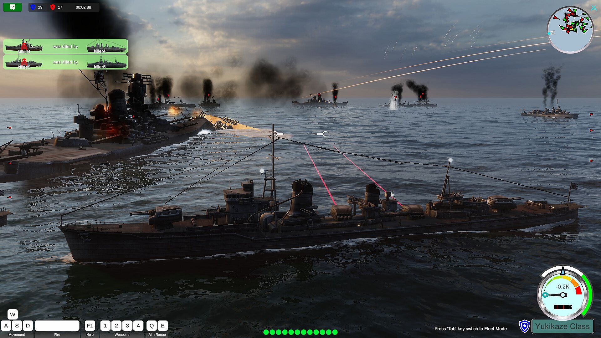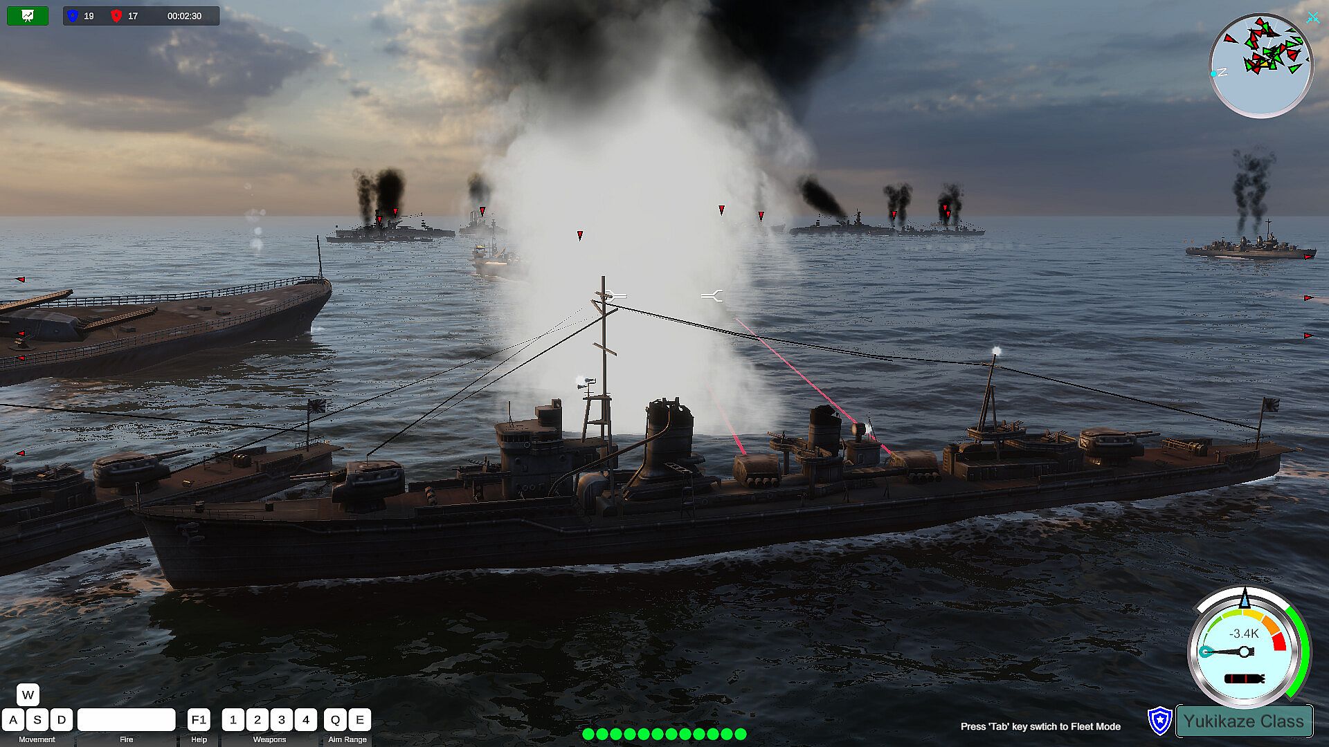 The way players drive their warships is a very simple traditional way, W key, S key to upshift and downshift. The speed of each battleship is set in proportion to the speed of the real battleship. When the engine gear of the ship changes, the engine will gradually increase or decrease the speed to the specified gear speed, so the player only needs to change the gear instead of pressing the W or S key to drive.