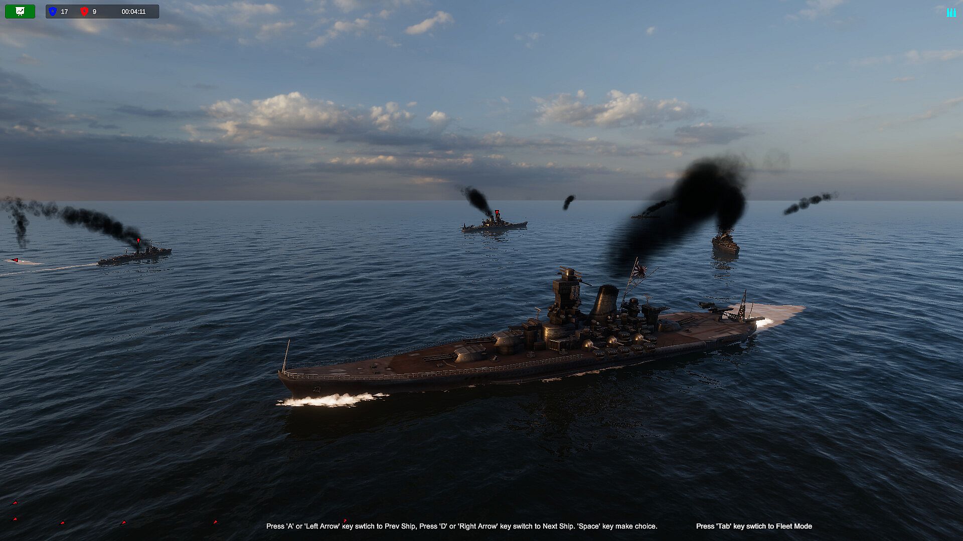 During the level, when the warship controlled by the player is sunk, if there are other warships in the player's fleet, the player can use the A key and the D key to switch and view other warships in the same fleet. After switching, click the space key, the takeover of the control right of the currently switched battleship is completed.