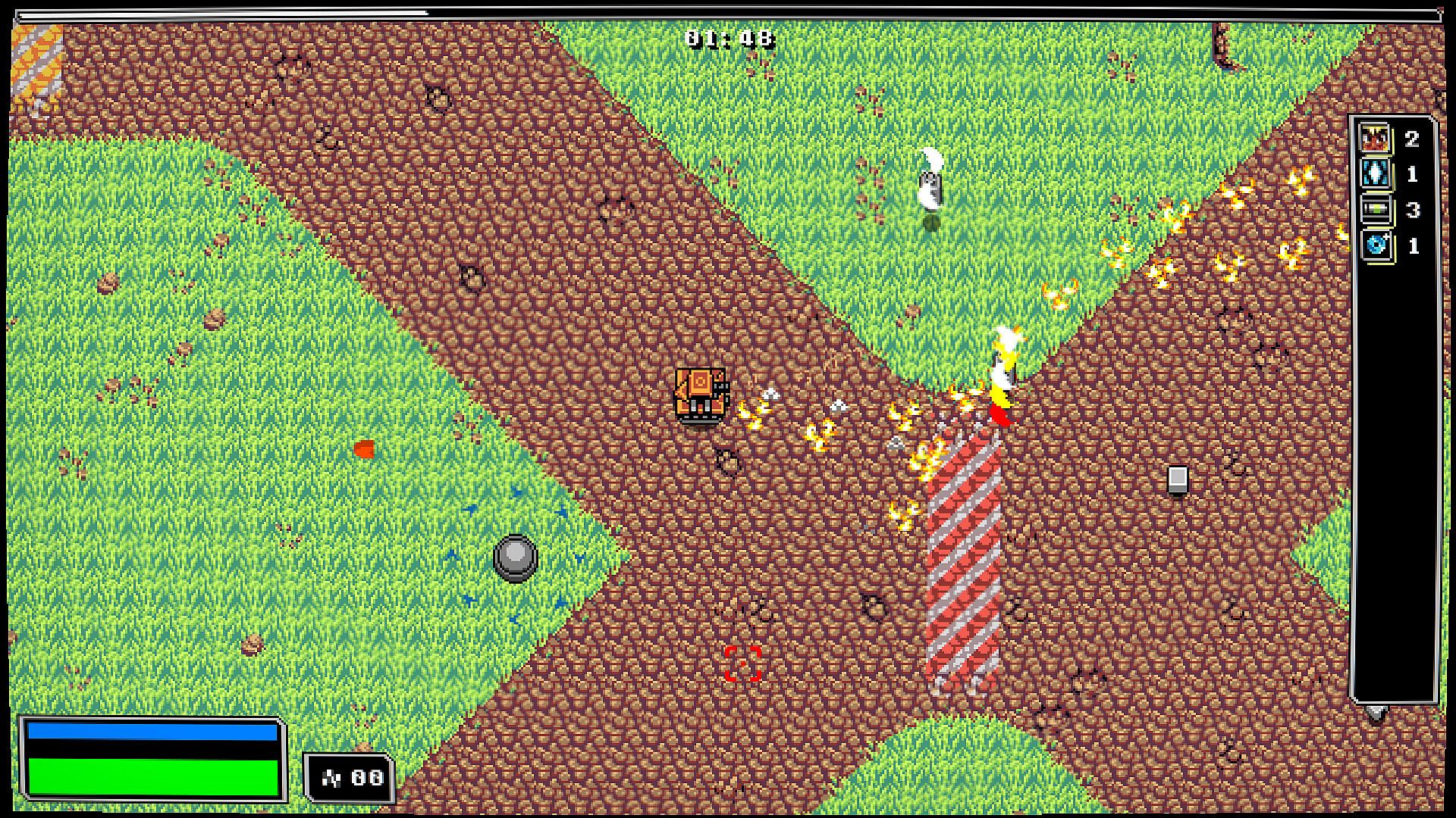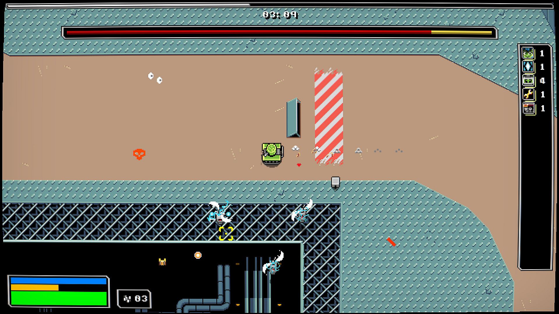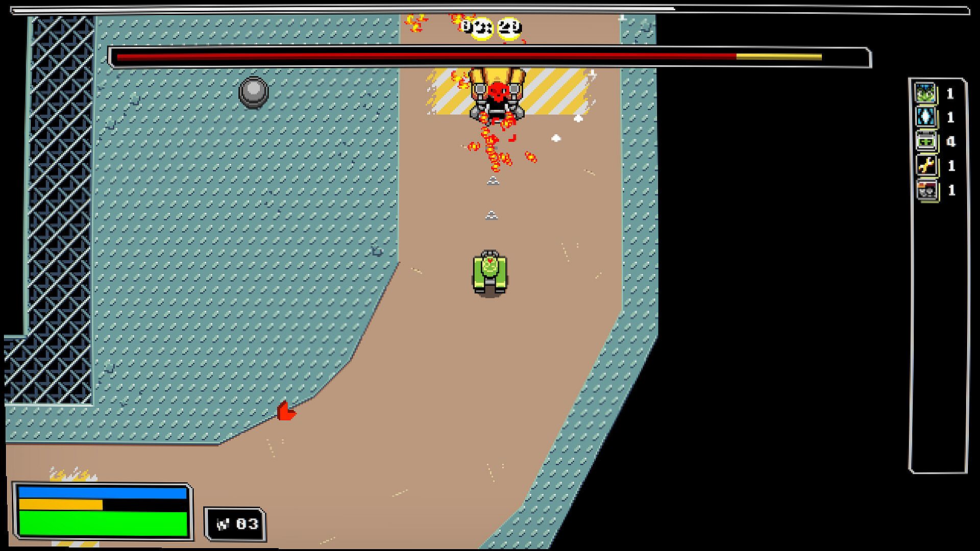 In Iron Rain, after selecting a character and a stage, you will be faced with a racetrack and a growing horde of enemies. Completing laps of the track will expand it, and increase the enemy onslaught, spawning mini-bosses, and eventually the Stage Boss.