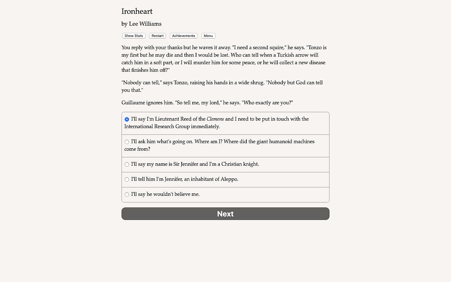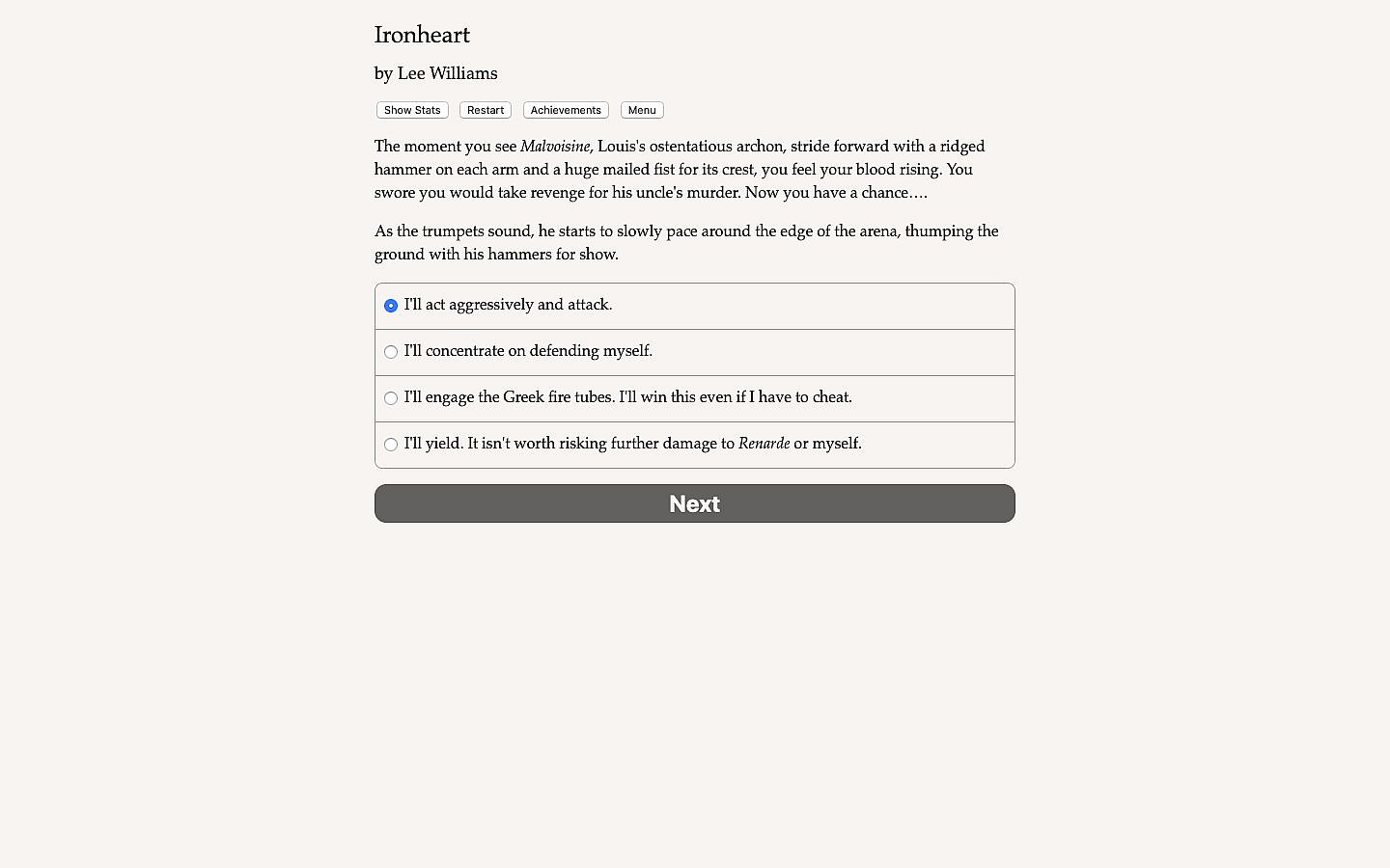 Ironheart is a 250,000-word interactive novel by Lee Williams. It’s entirely text-based, without graphics or sound effects, and fueled by the vast, unstoppable power of your imagination.