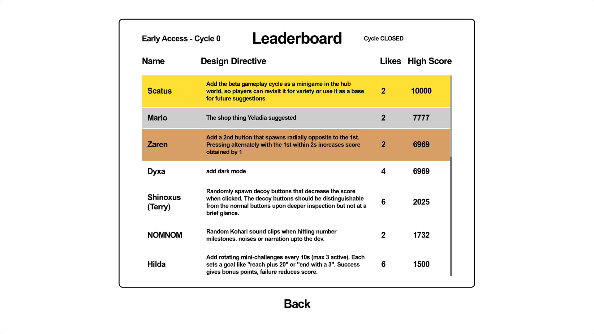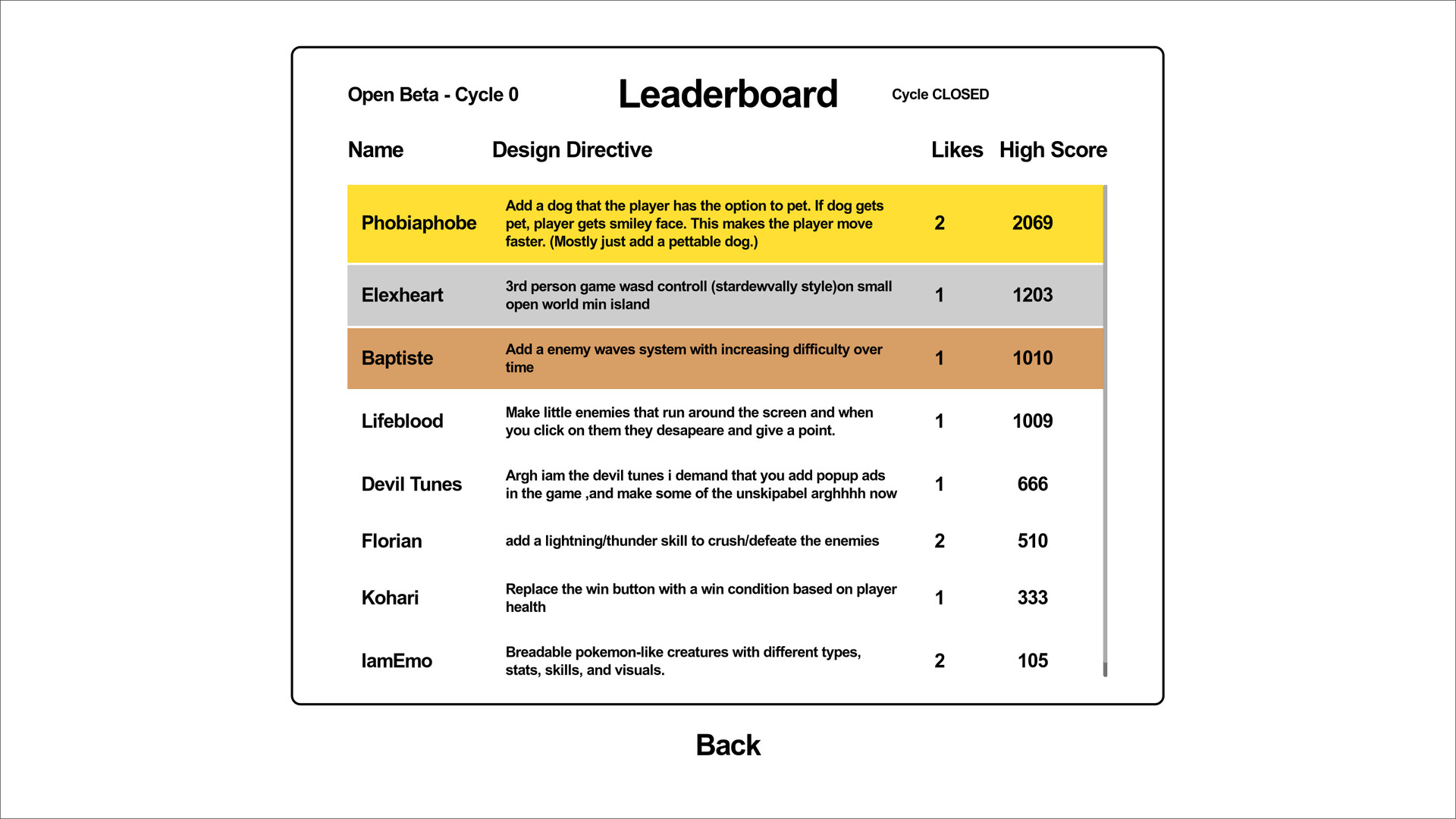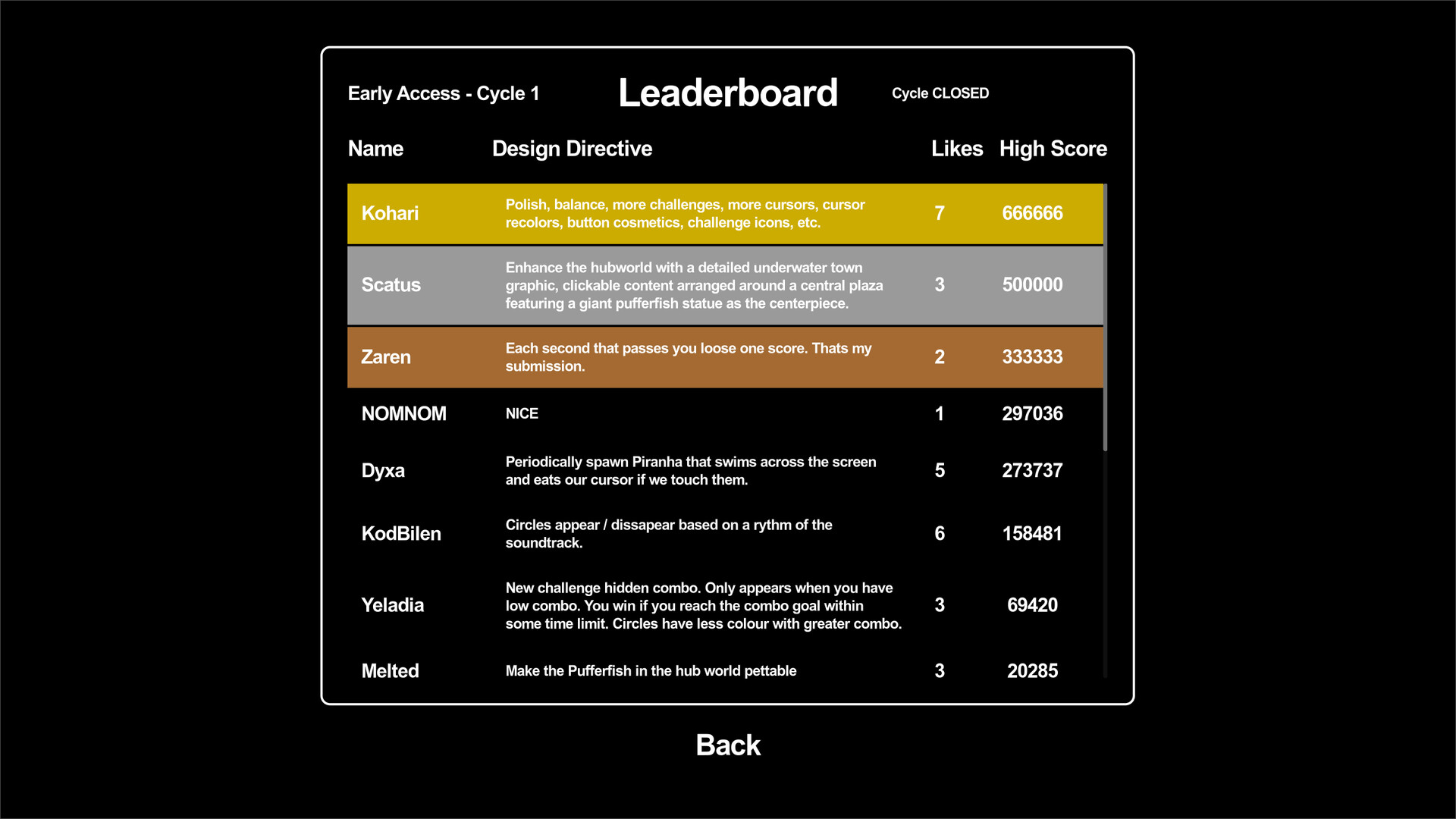 At the end of each cycle, the top 3 global scorers and top 2 most liked submissions will be chosen and implemented in the very next update cycle.