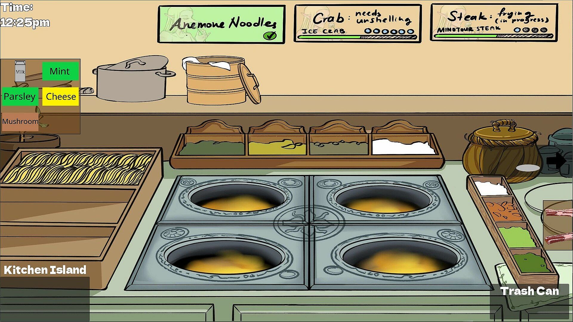 Yet, in front of you, were unmistakably: A kitchen countertop, stoves, and shelves and larders stocked with colorful ingredients.