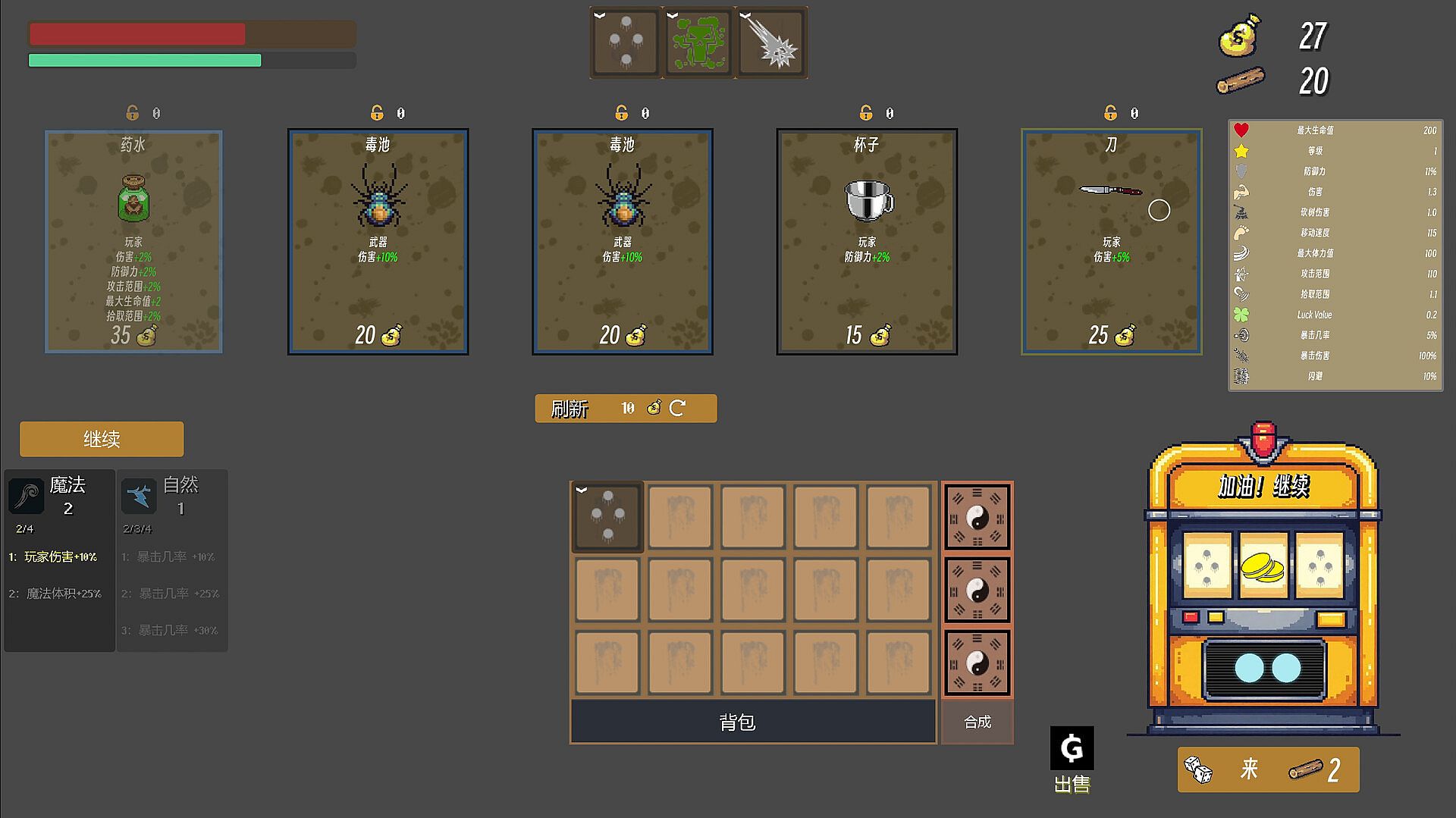 All weapons auto-target enemies and are obtained exclusively from the 1211 vending bot, with a fresh random set offered every run.