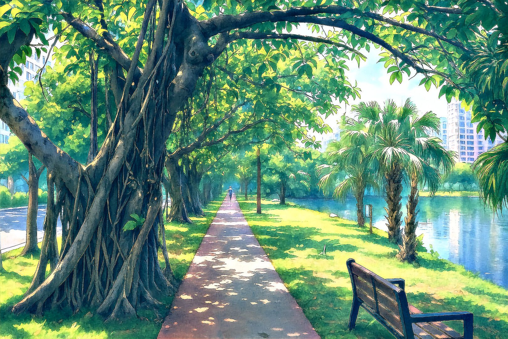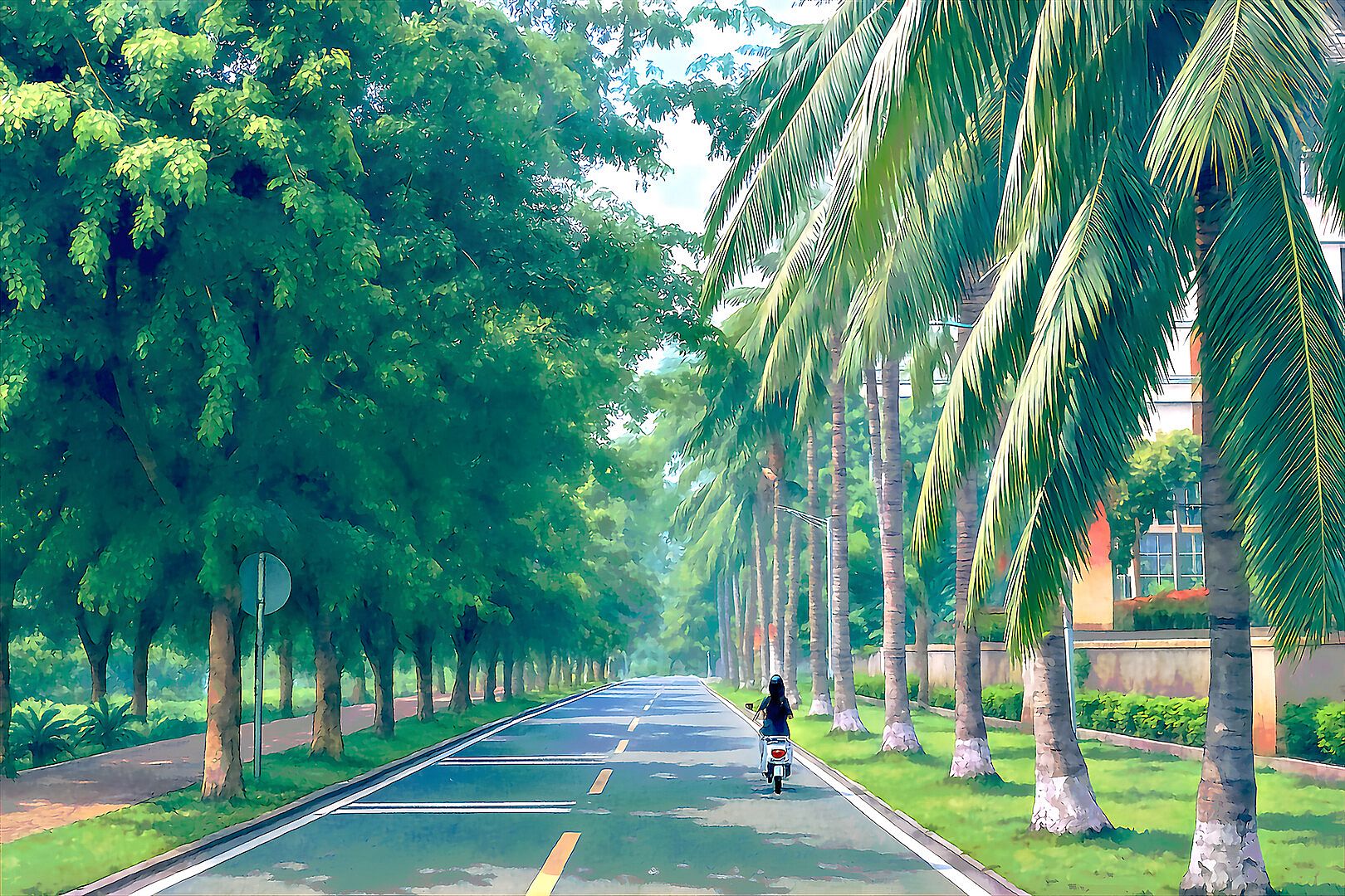 Selected real-world Hainan landscapes are reproduced through a hybrid process: