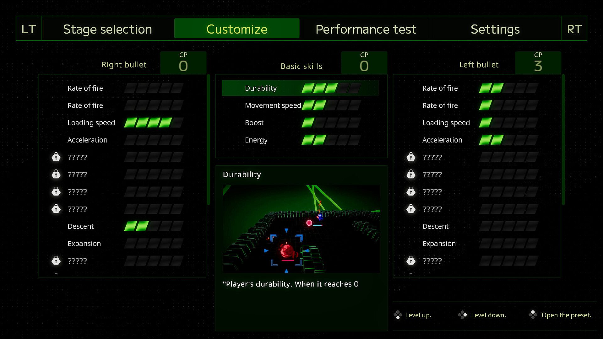 Players can adjust various parameters through customization. Basic parameters such as "movement speed" and "durability," as well as attack parameters like "bullet speed," "trajectory," and "rate of fire," can all be adjusted.Parameters also include "bullet effects" that grant special effects to attacks. There are effects related to the trajectory of bullets such as "acceleration," "curve," and "tracking," as well as special bullet effects like "expansion" and "absorption." By combining these, players can create their own custom bullets to suit their preferences.