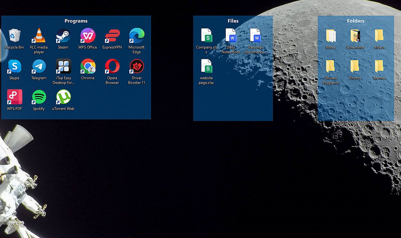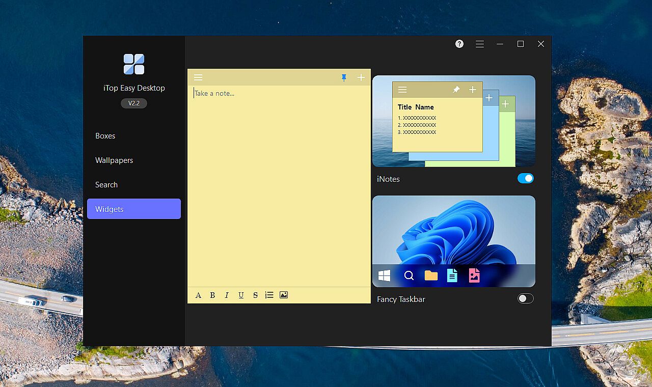 iTop Easy Desktop: a free and easy-to-use desktop manager and wallpaper tool for Windows. Automatically organize icons, files, and folders. Create private boxes. Enjoy quick search access, free Calendar widgets and more. Experience a clutter-free desktop and maximize productivity with this powerful App.