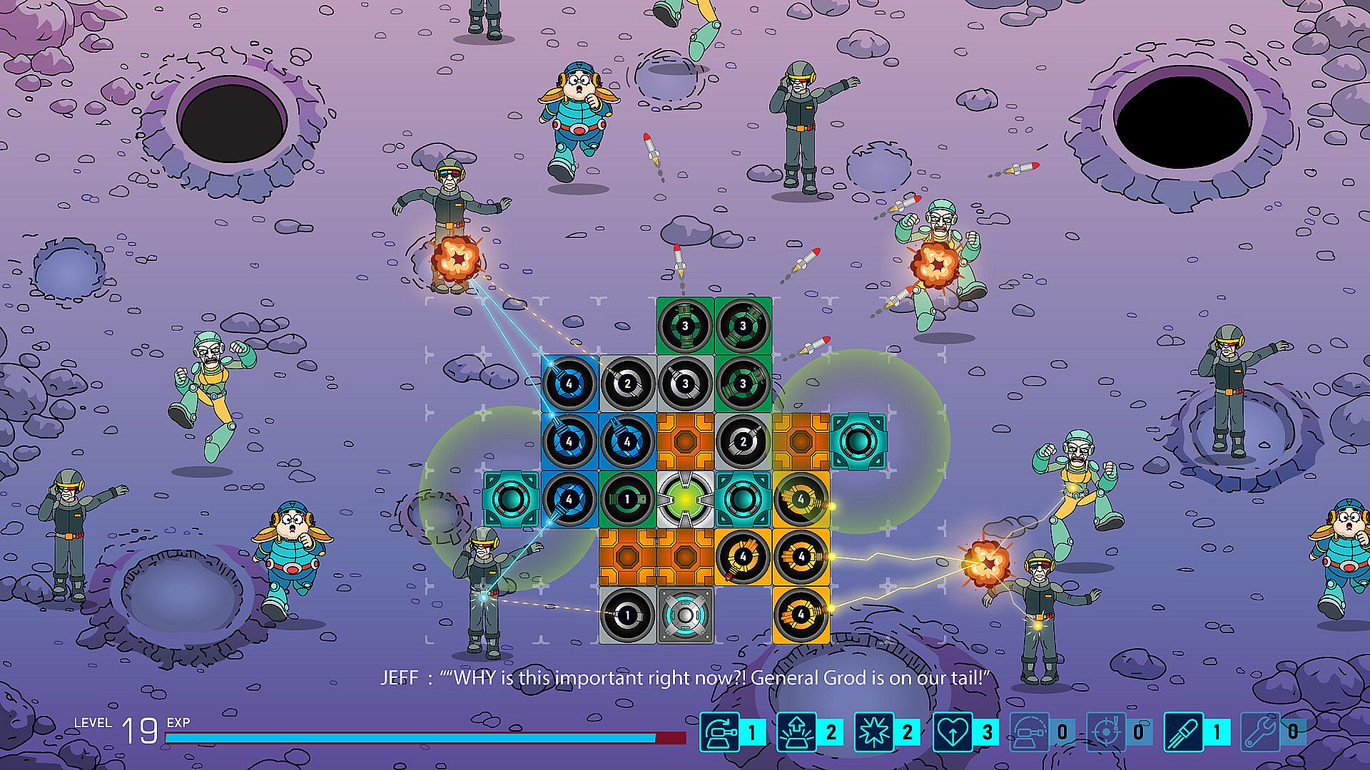 Every boss encounter opens with a fully animated, voice-acted comedy scene where misunderstandings escalate and Jeff’s reputation grows more absurd each episode.