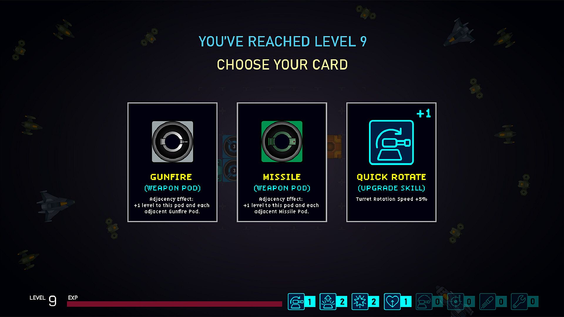 Each level-up presents 3 random cards that shape your run.