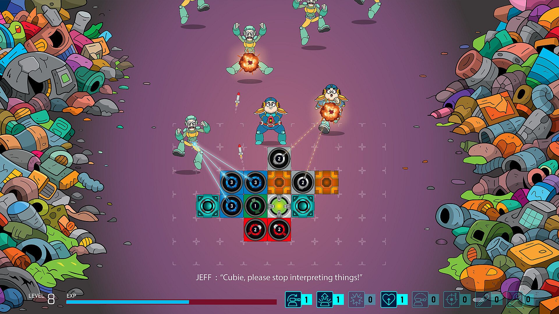 You play as Jeff, an ordinary human mechanic trying to survive, and Cubie — a small robot cube who keeps “helpfully” reinterpreting Jeff’s actions to increasingly powerful alien bosses.