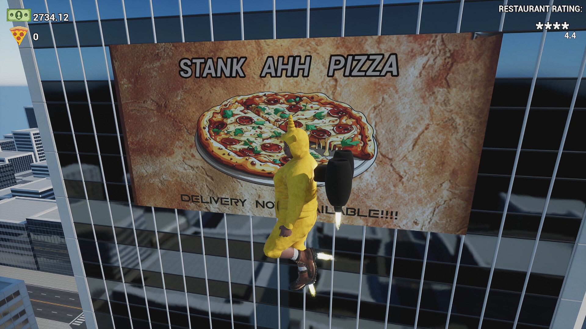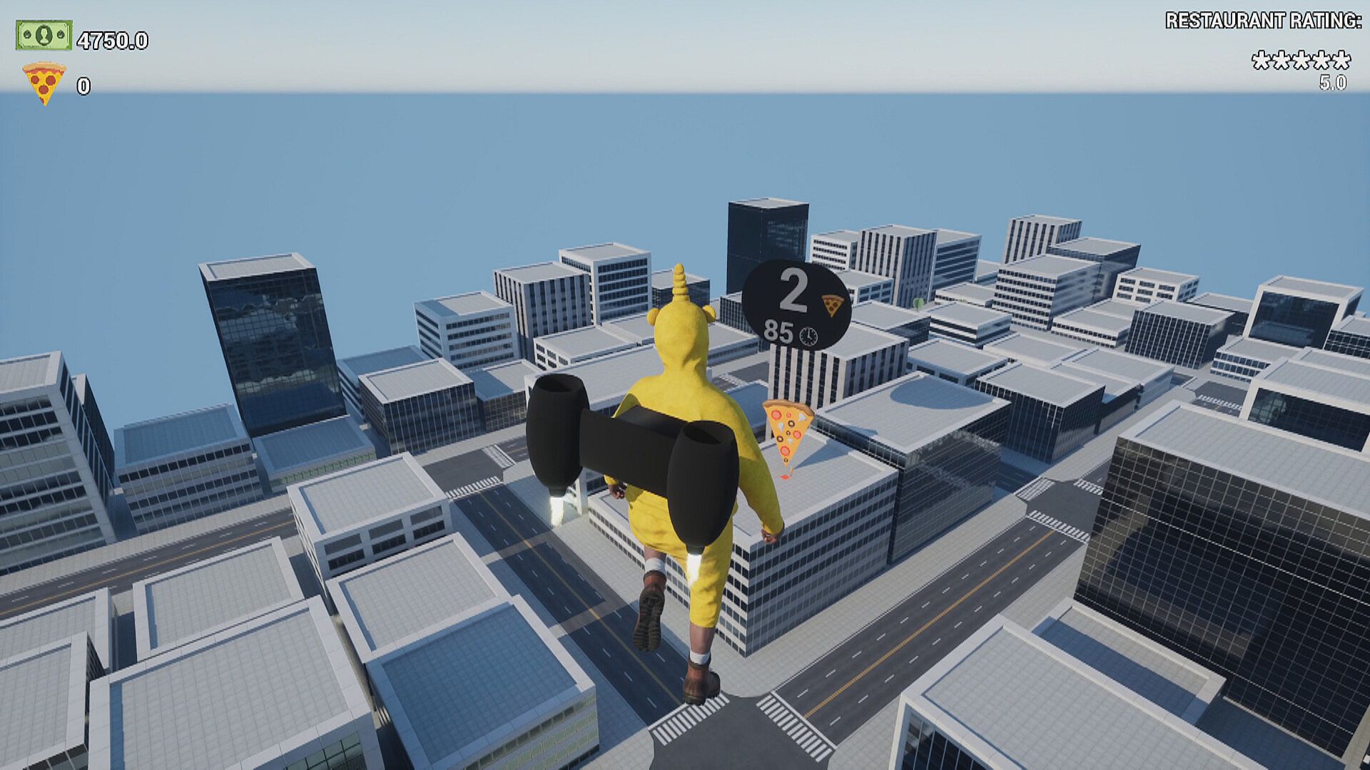 You possess a trusty Jetpack with infinite fuel capacity, and you must FLY AROUND THE CITY delivering pizza orders: on time, with the correct amount.