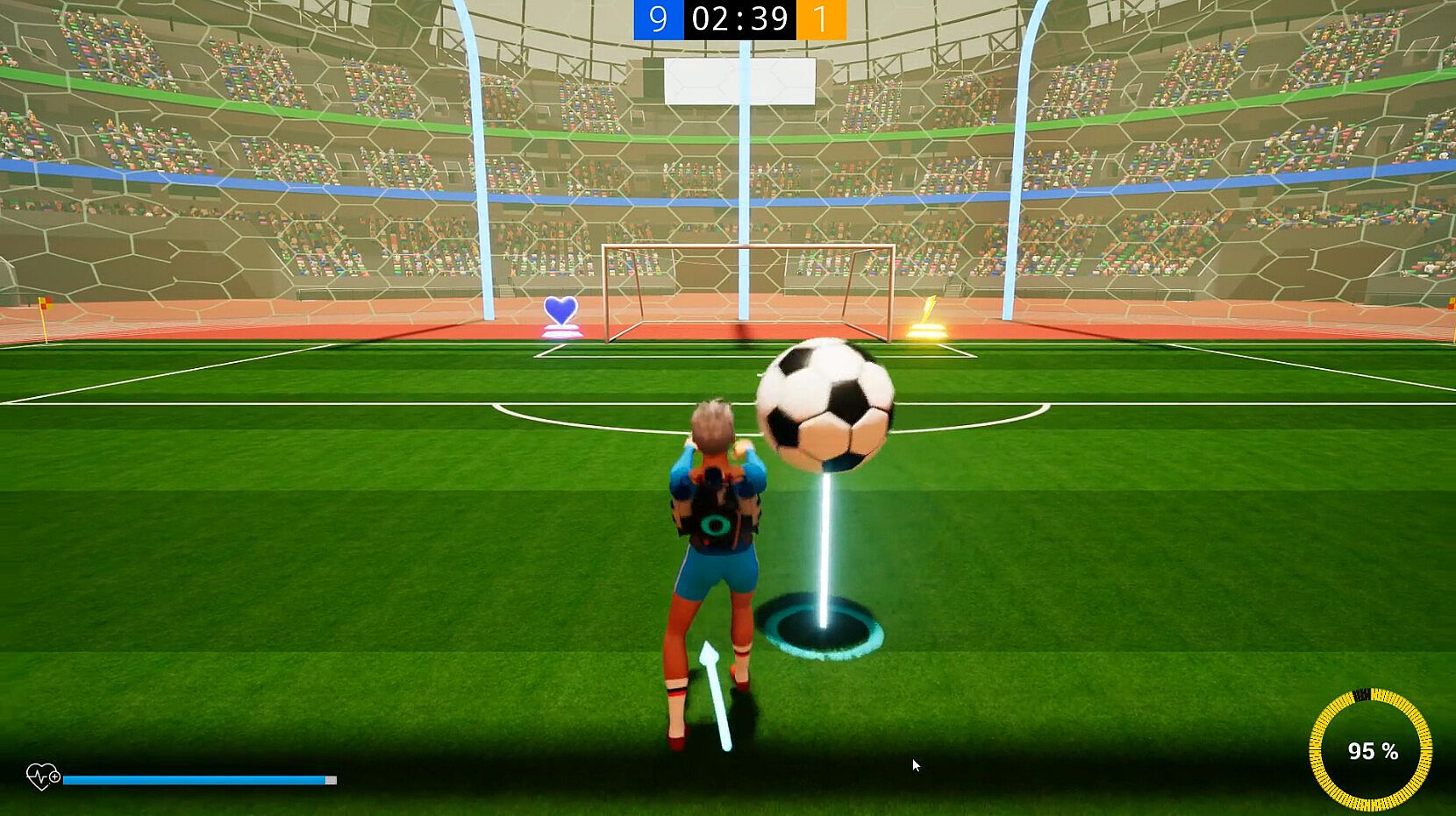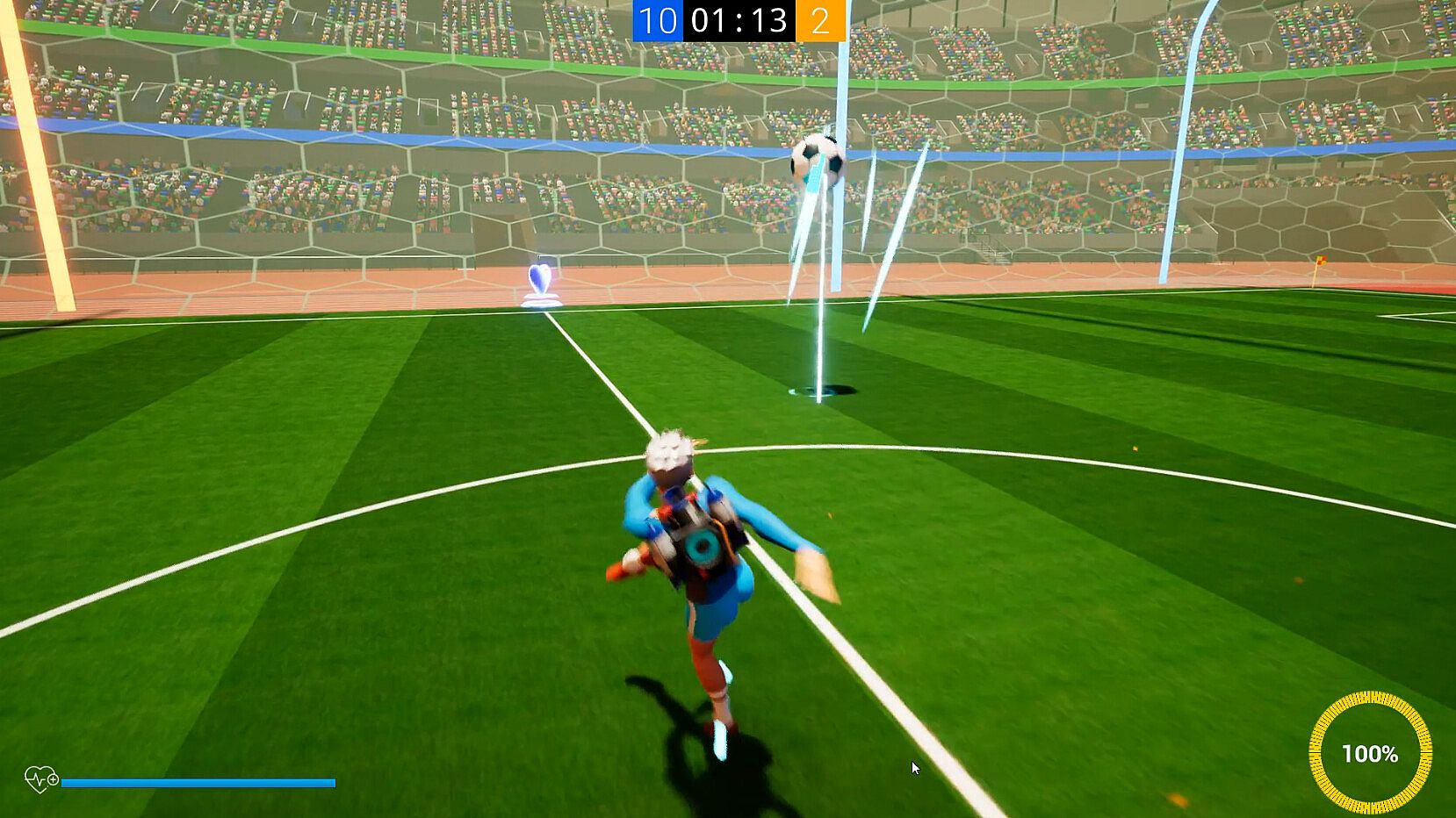 In air players can tilt forward or backward (pitch), tilt left/right (roll) in order to change direction while in air using jetpacks but also kick and head the ball to attempt to score.