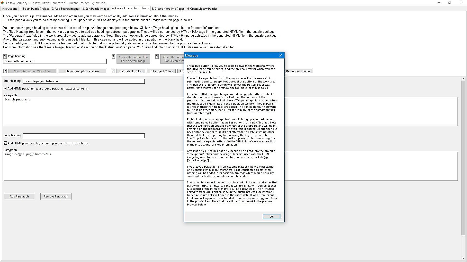 The 'Create Image Descriptions' page lets you create optional description files for each puzzle image. These will show up in the 'Image Info' tab page on the puzzle client. If the images you are using are from a holiday adventure, for example, then this page lets you add more information about each puzzle image to share that adventure with the person completing the puzzle.