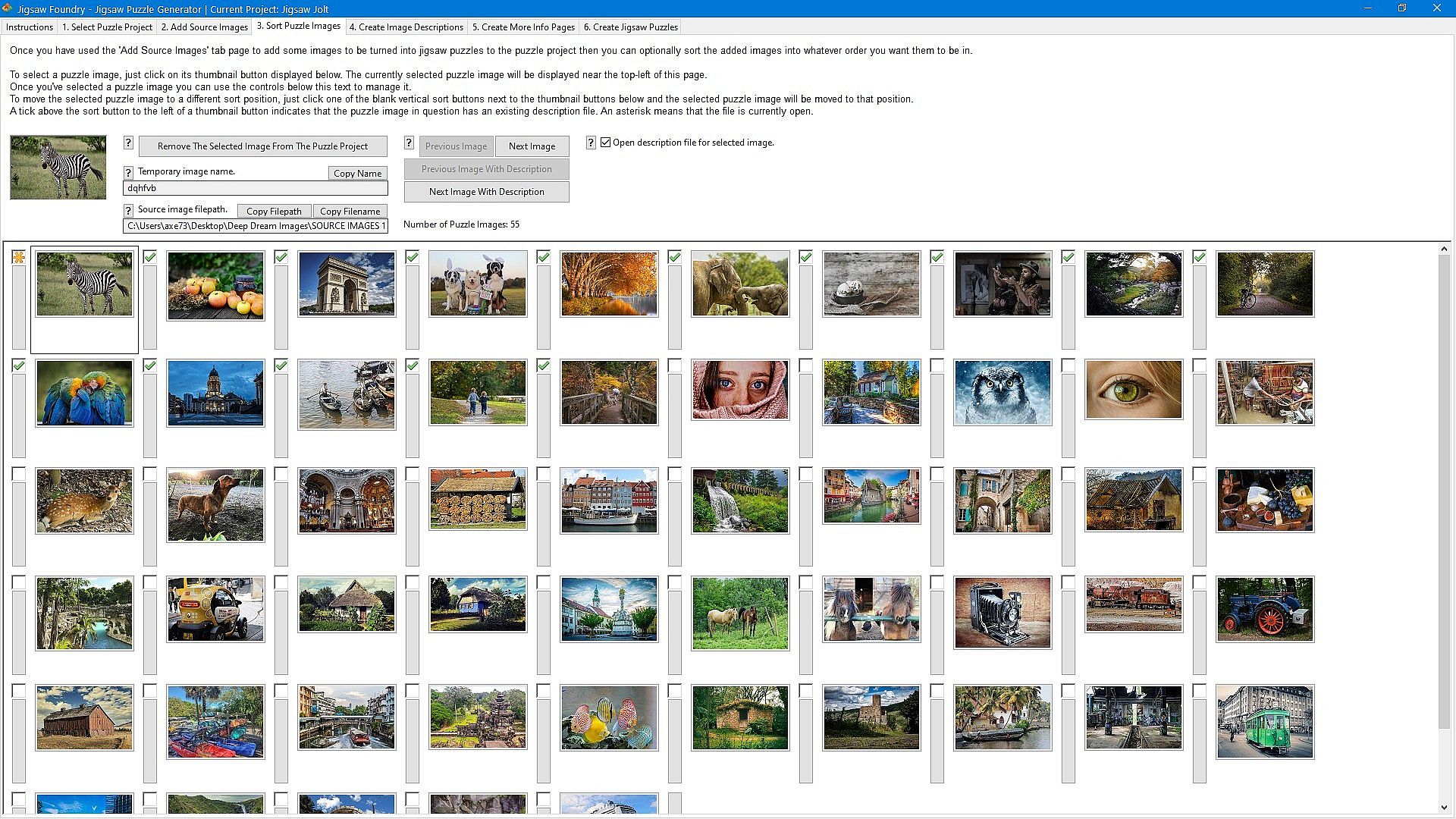 Once you have your project created you'll want to go to the 'Add Source Images' page to add your puzzle images. You can add images using drag-and-drop, copy-and-paste, or via a file requester. You can add additional images at any time.