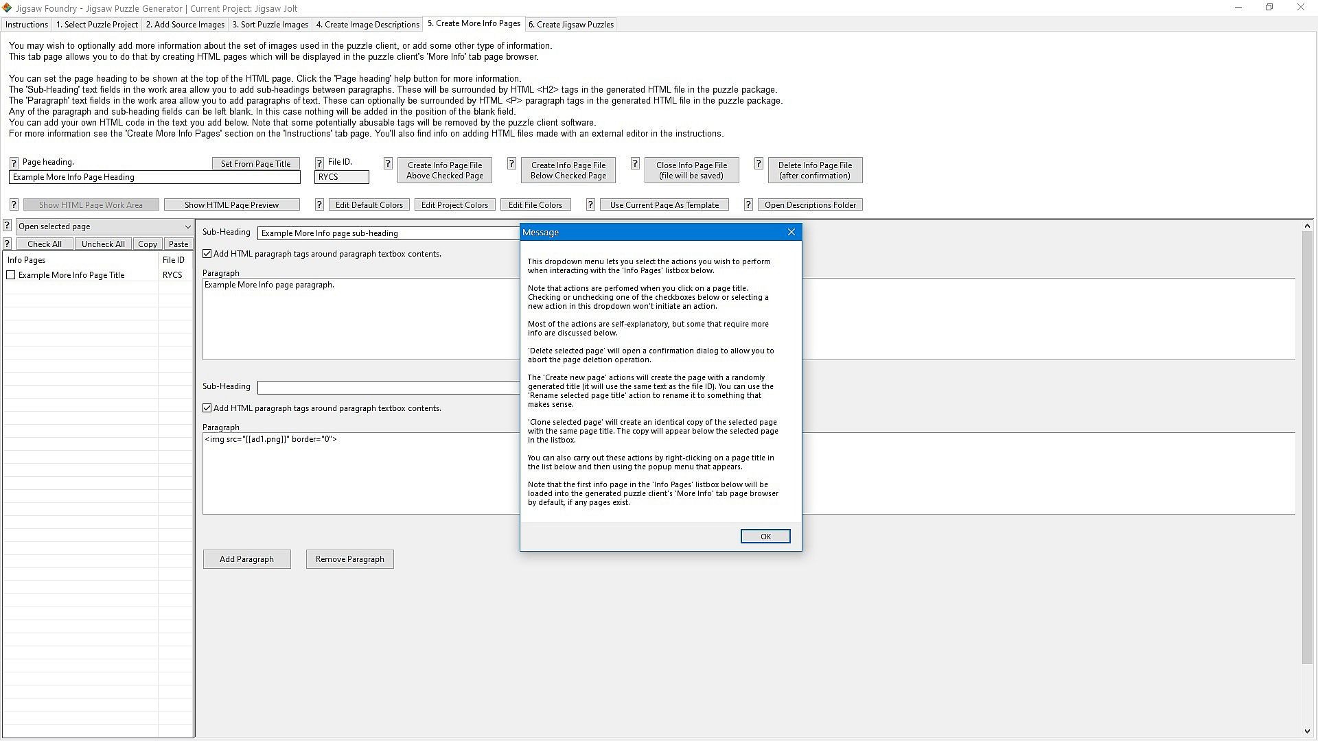 If you have more general information that you want to share then the 'Create More Info Pages' page lets you optionally create multiple info pages that will appear on the puzzle client's 'More Info' tab page. This page has a navigation sidebar that allows the user to browse the information files that you have provided.