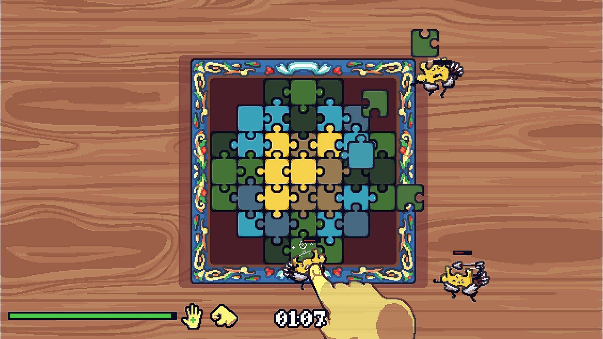 Play as a floating hand in a surreal pixel arena. Poke for precise hits, Slam for crowd control, then grab defeated enemies and snap their pieces onto the central board.