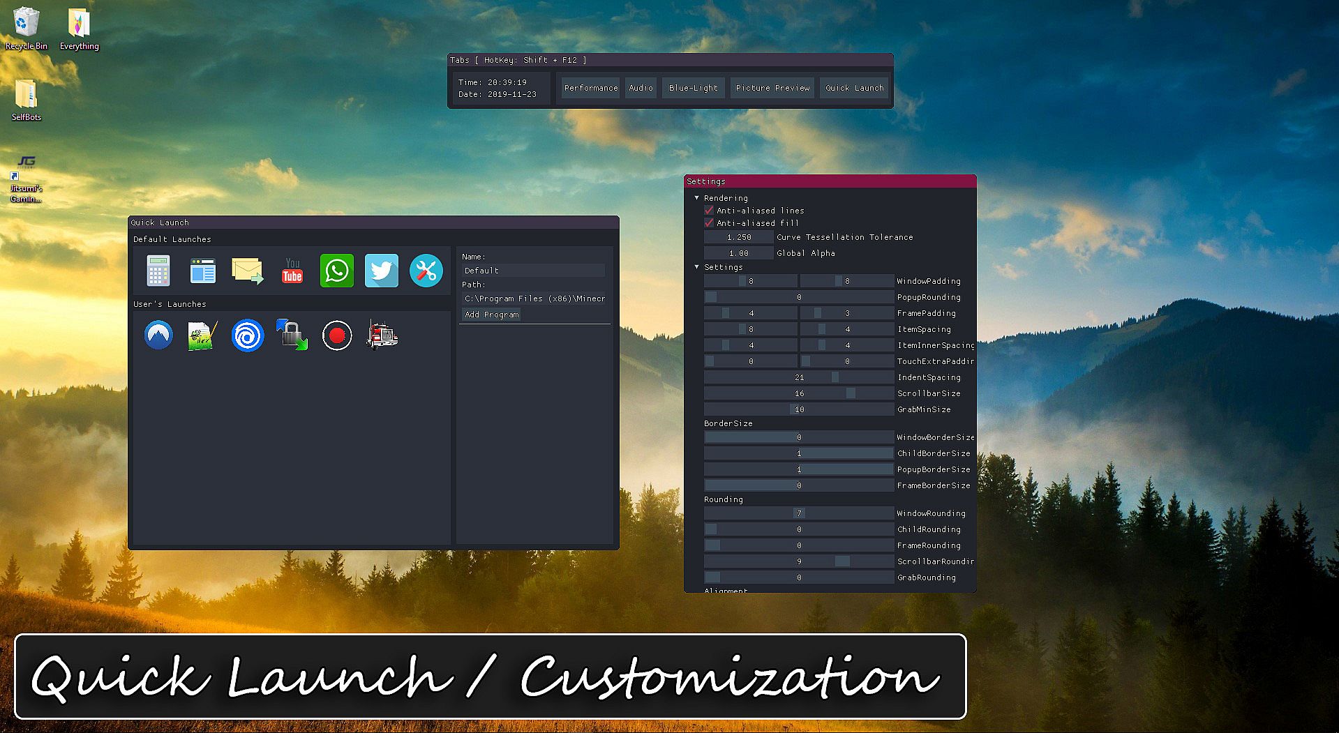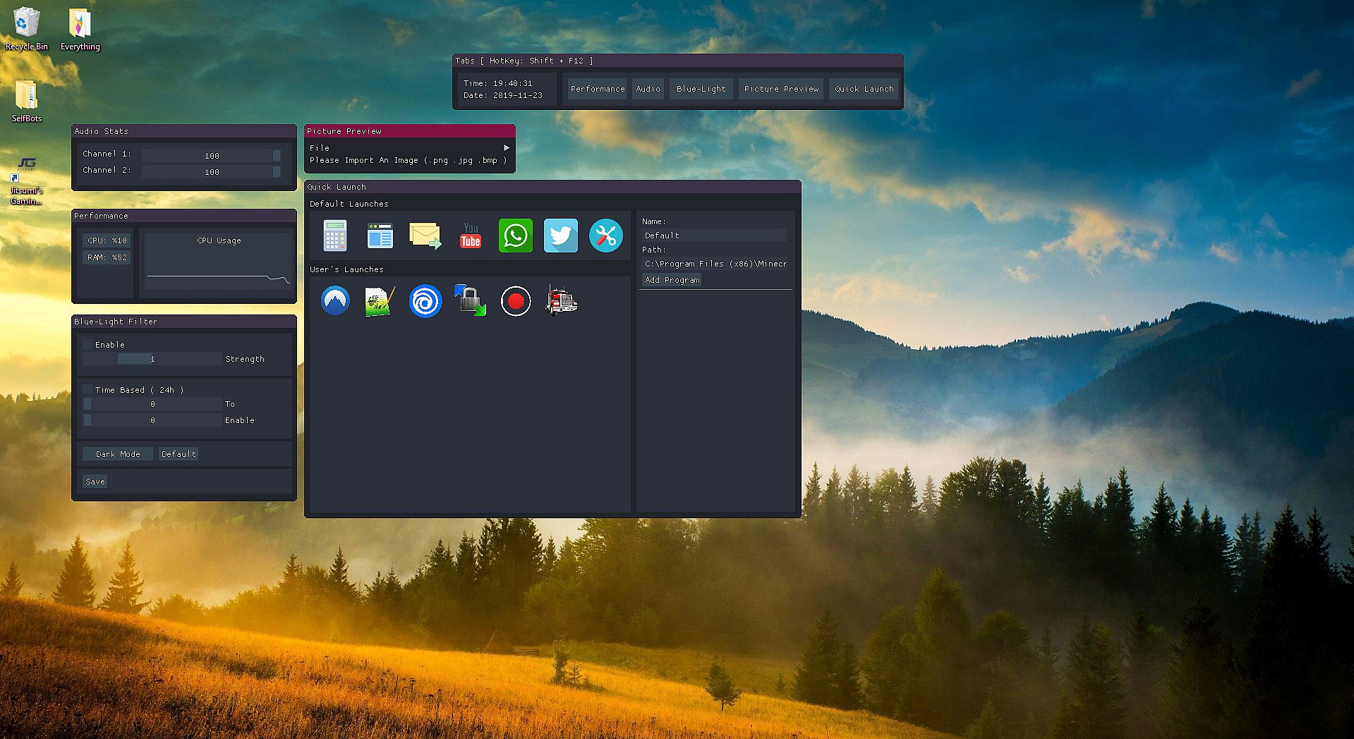 Jitsumi's Gaming Overlay is a lightweight program that is meant to provide conveniences to gamers around the world. We do this by allowing users to have quick access to default apps or custom user-added programs and allow quick access to make other features with a click of a button. This is done by having an overlay that goes over your games / whole desktop to allow users to perform simple tasks and to be able to check things such as the time, date and your PC's usage. By allowing these interactions, we make life simpler for users as performing tasks such as looking at the time, changing audio settings and so on can now be done in no time and with a click of a button.Feature List:
