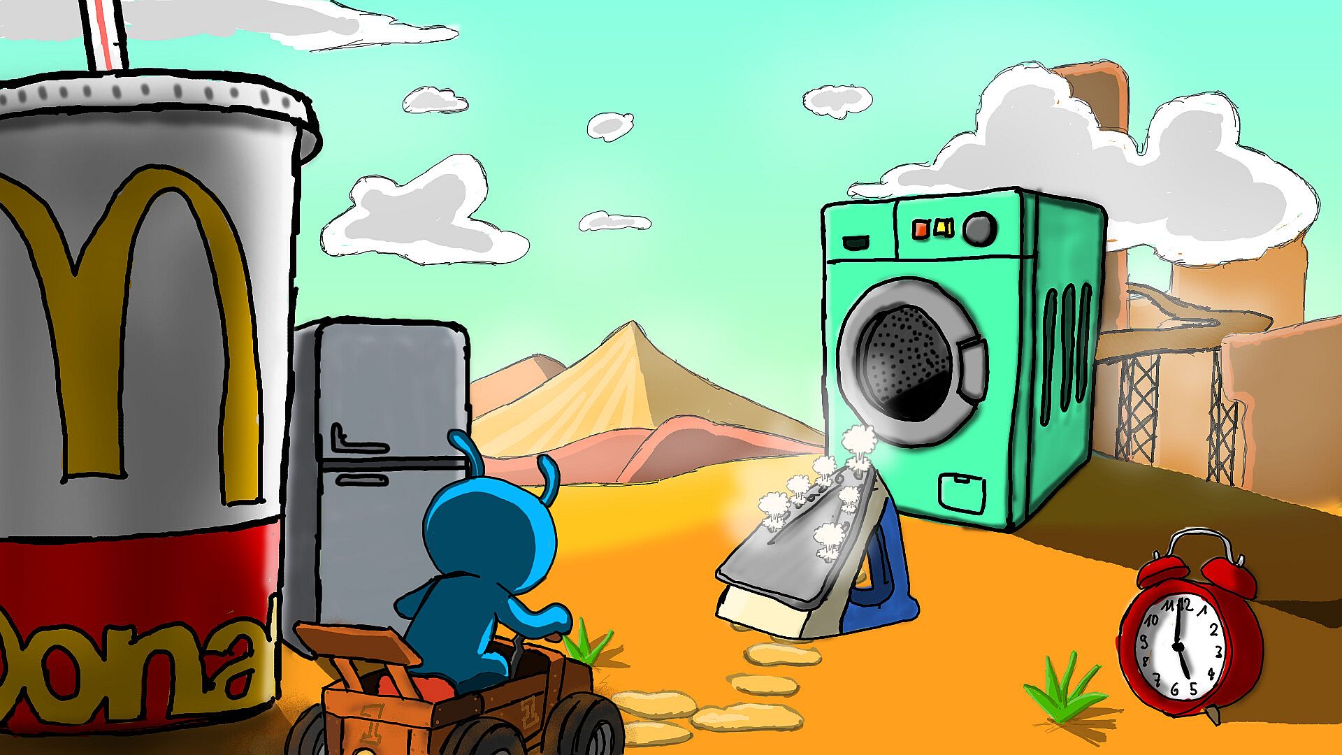 And it’s not just one kind of trash. This is the full timeline. Rusty toasters from the 1950s, busted VR headsets, retro soda machines, broken mech parts, neon signs, food wrappers from the future. It’s chaos.