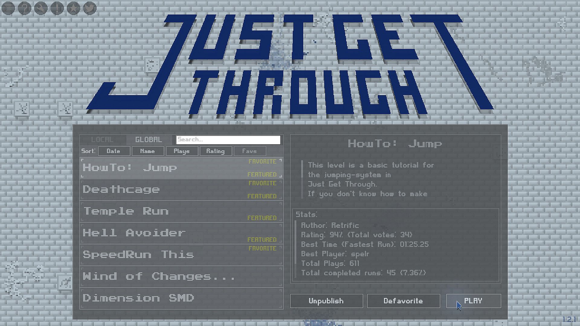 The procedurally generated platformer Just Get Through, a game by the german, one-man game studio Retrific, features various gamemodes, daily runs, steam leaderboards and trading cards, a sandbox, user-generated levels, explosions, traps, precise walljumping and more. Together with roguelike elements like permadeath, procedural generation, an endless amount of challenging levels and more this underrated game forms your next platformer challenge. You play as a dude trapped somewhere in a jungle-like environment. You try to escape but there is no exit - only those portals. And everytime you jump through one of them, you just land in another dungeon with even more traps.
