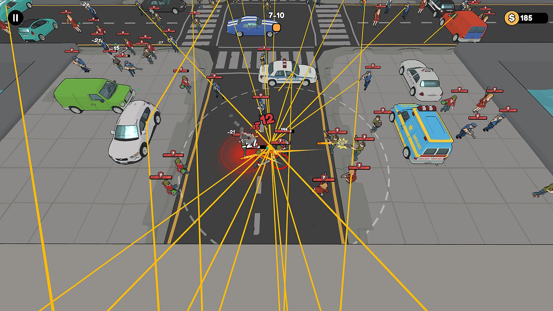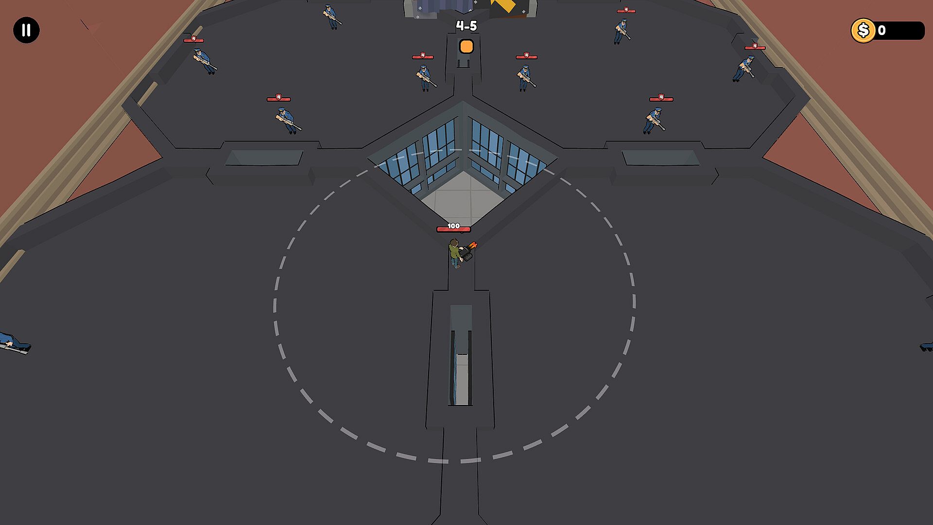 In this city, player can move to approach the enemy with enough distance, gun will auto shoot the nearest enemy.