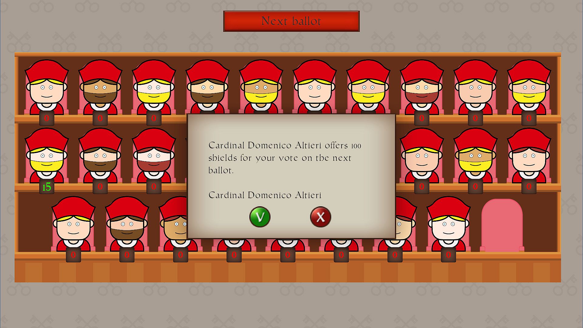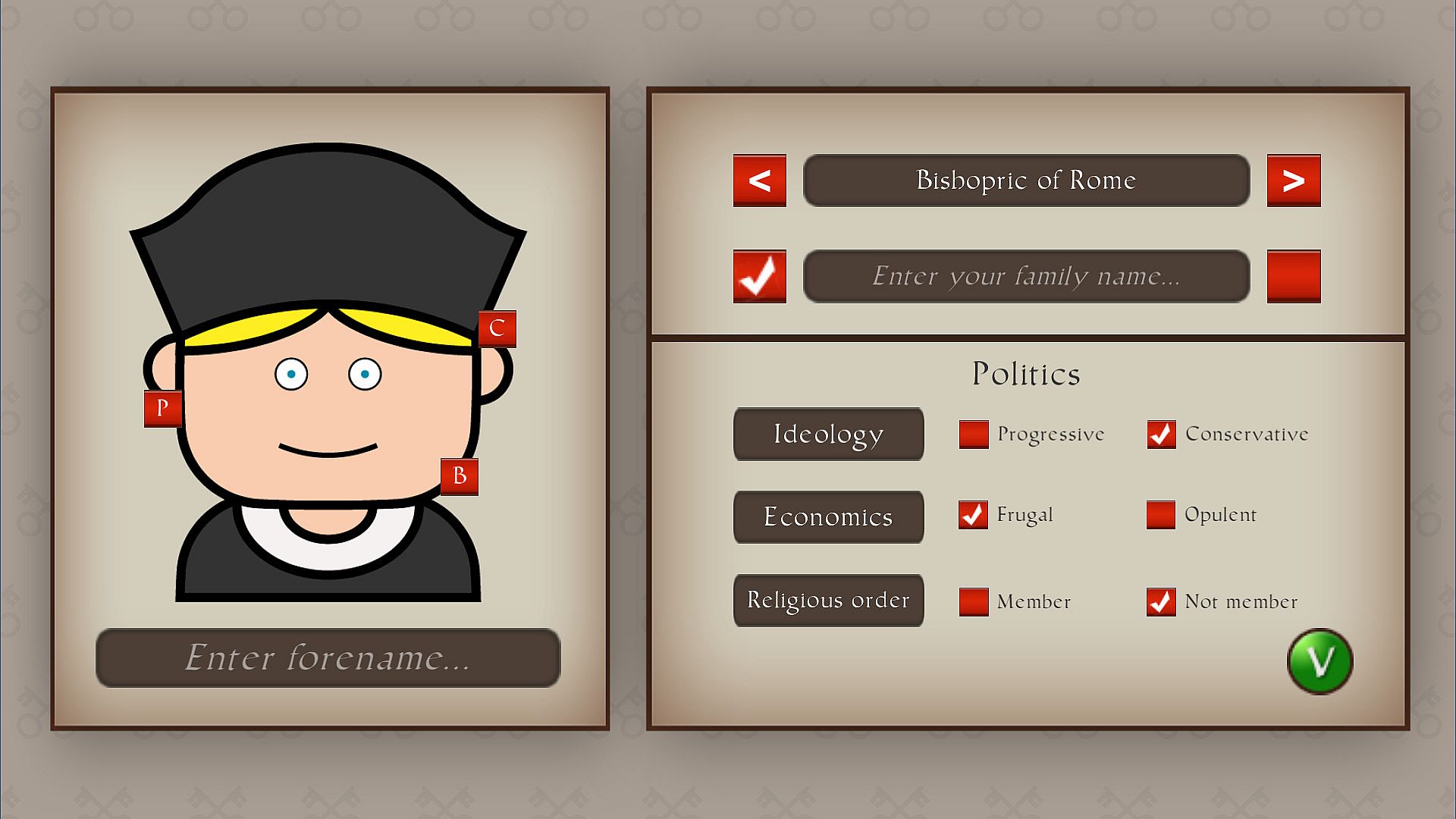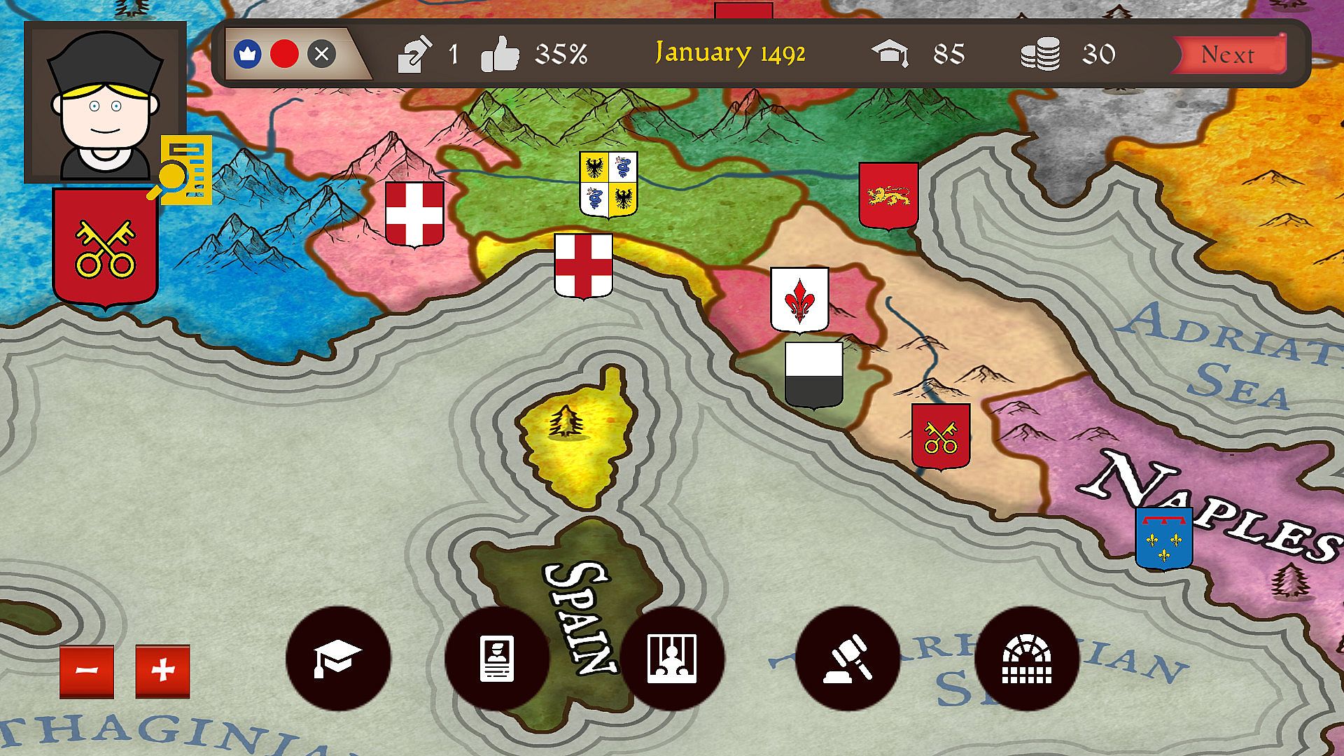 Even if you’ll never become Pope, this does not exclude you from running a state. Decide how to manage the resources of the state. Invest in good works or divert the money to you and your relatives. Will you be a good or a lousy administrator?Create a dynasty