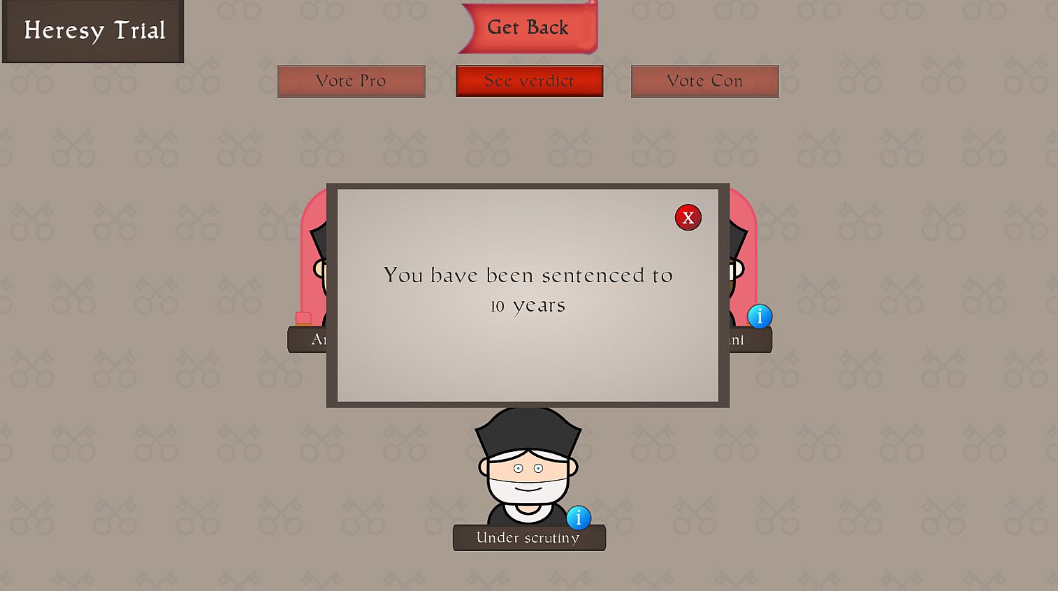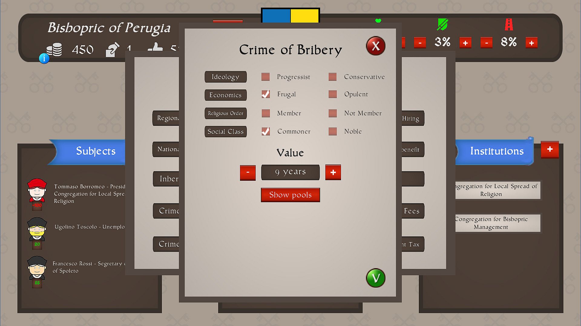 God's law is not enough. Men must also follow the laws dictated by you. Taxes, length of sentence and regulations are only some of the things you will have to decide on. What is the proper penalty for taking a bribe? It depends on what guise you will be playing: champion of justice or corrupt opulent?Deal with processes