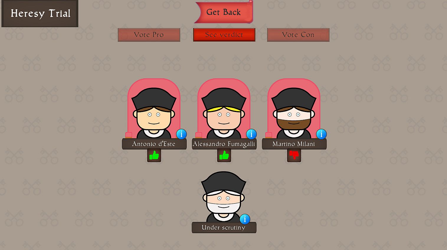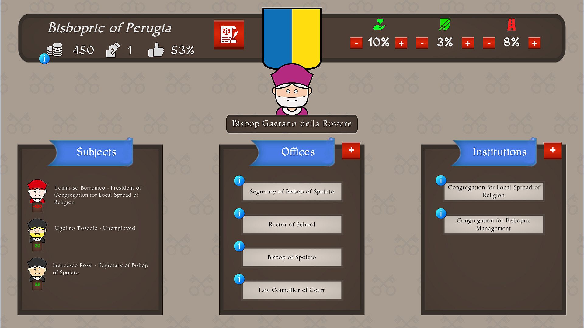 The Church of Rome is a powerful institution. And like any powerful institution, it must defend itself against the plots of its adversaries. The Holy Office is the Congregation set up specifically for this task: to find the enemies of the Church and destroy them. Decide for yourself whether the greatest threat to Rome is heretics, corruption or your family's rivals.Create offices