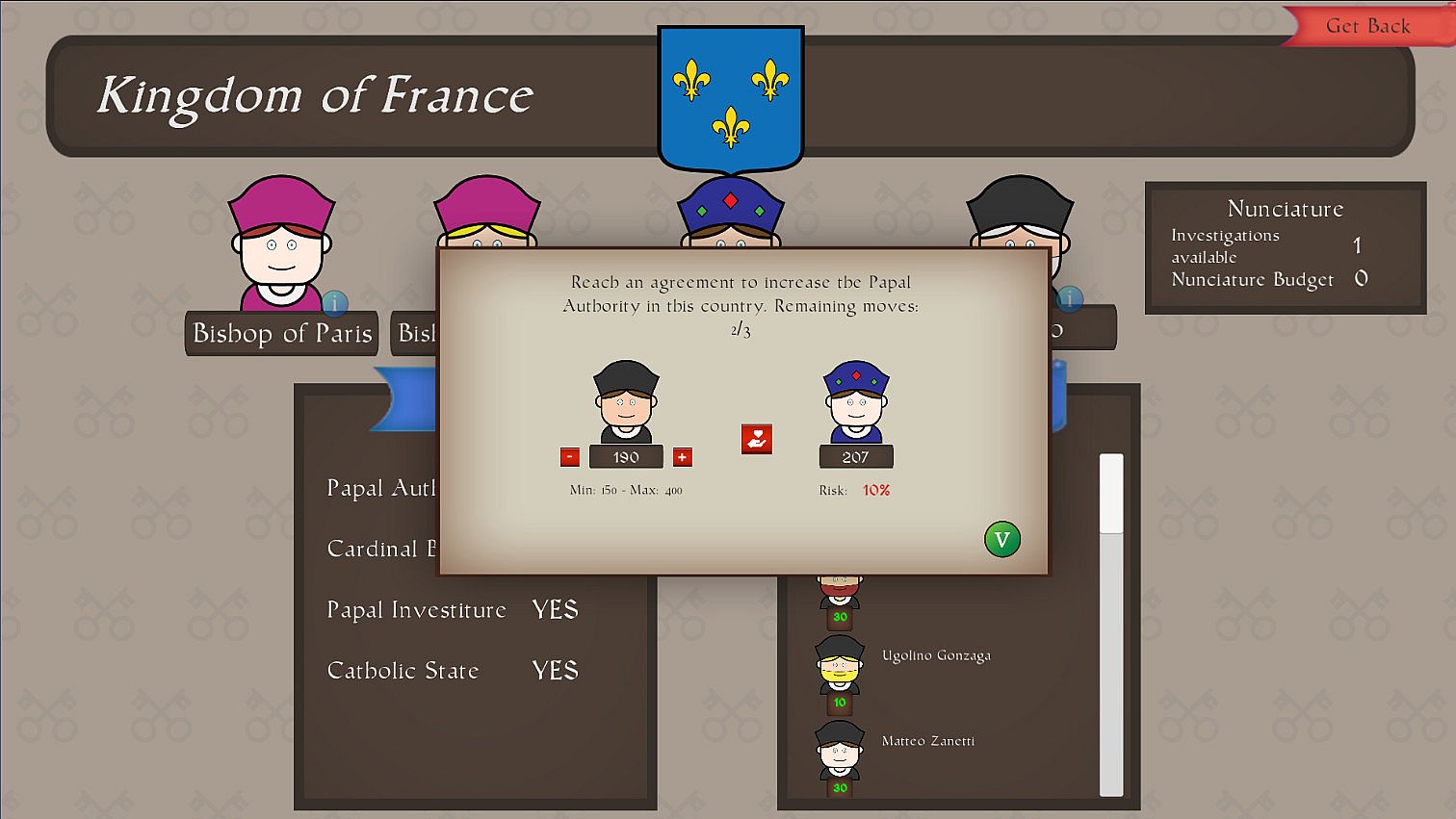 The Pope is not the only sovereign of Europe. Others are interested in getting involved in the affairs of the Holy See. Interact with the greatest courts of Europe. Defend the interests of the Church. Make agreements and ensure that all souls always remain under the wing of Rome.Change the laws
