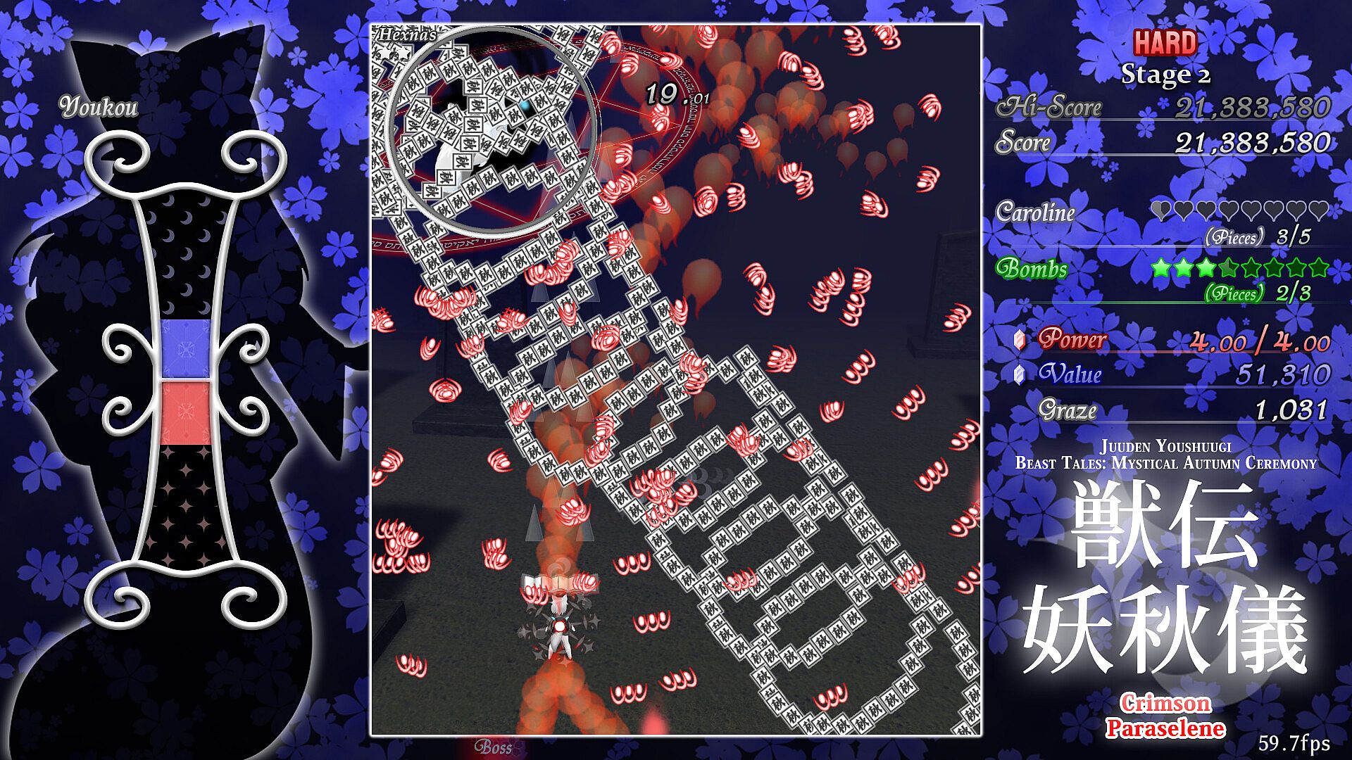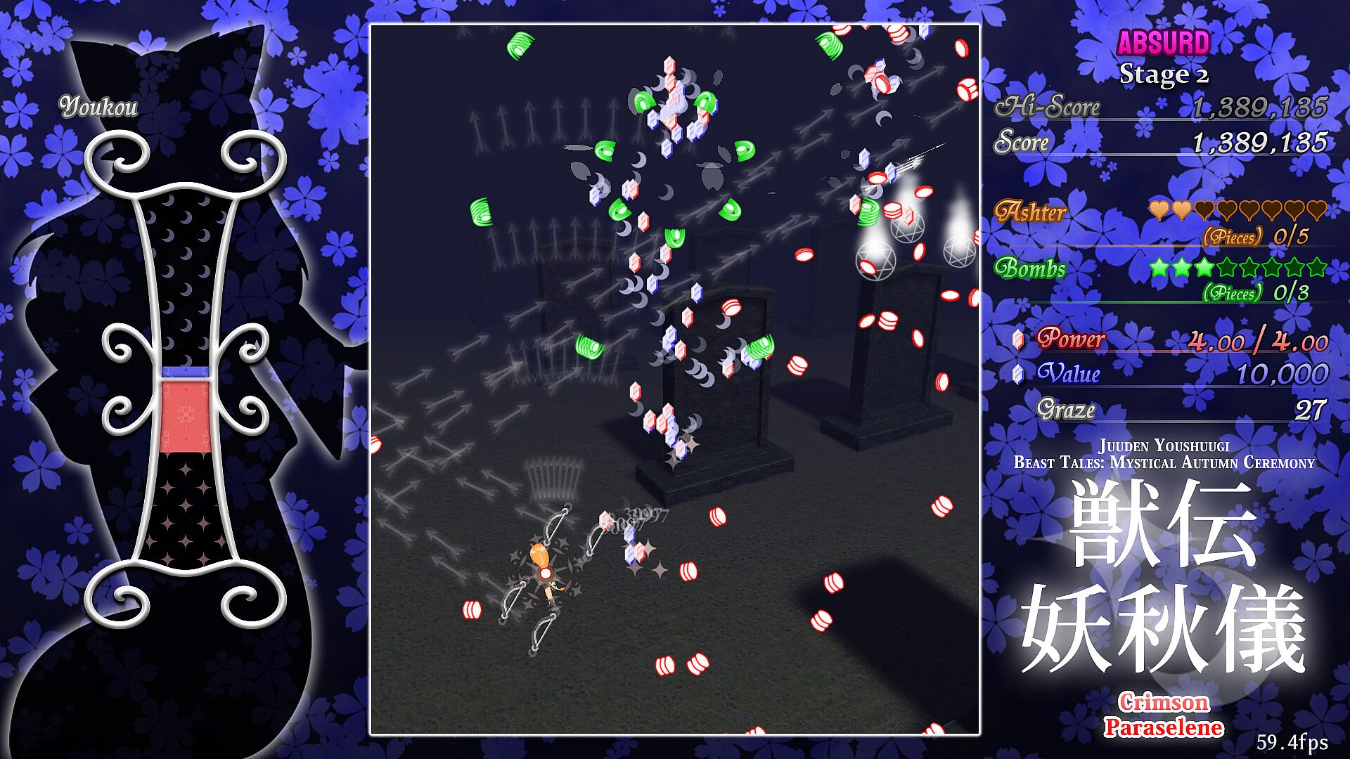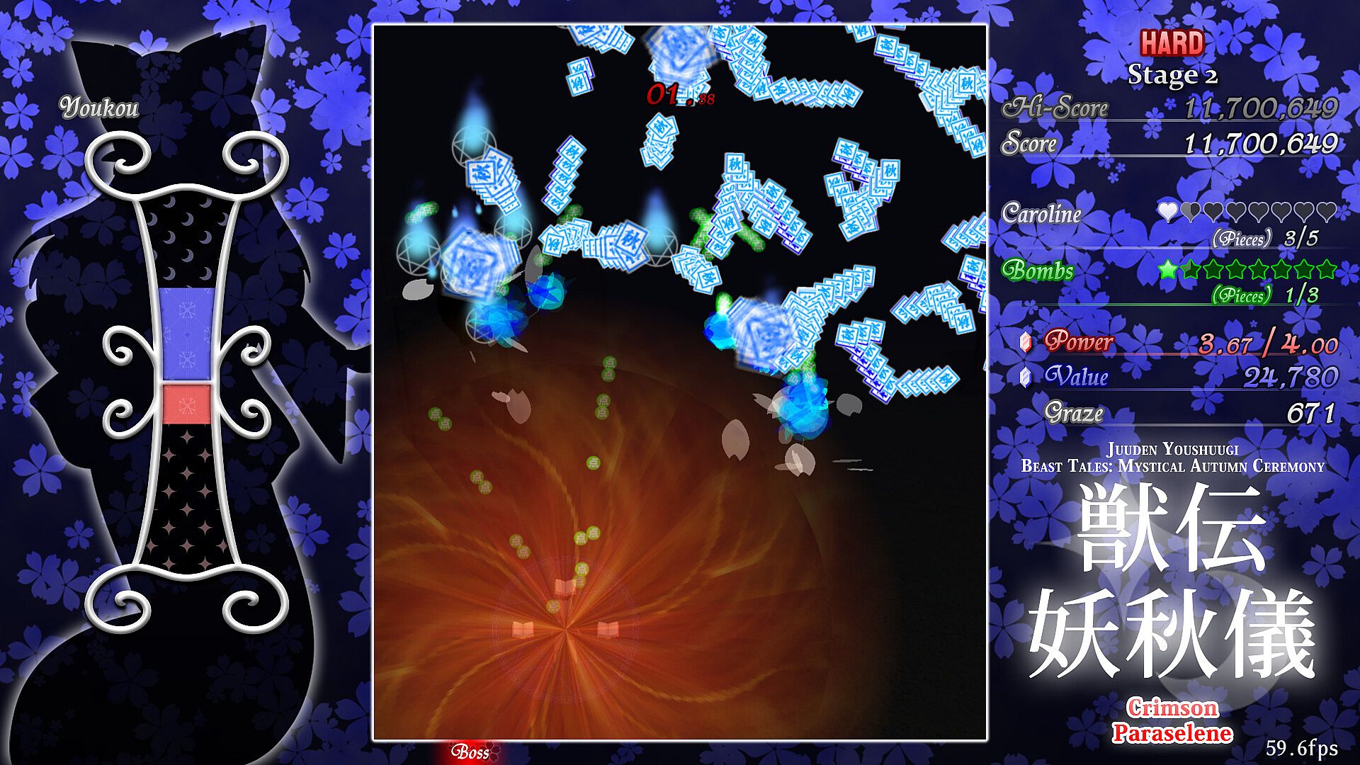 Juuden Youshuugi ~ Crimson Paraselene (獣伝妖秋儀 ~ Crimson Paraselene) is a bullet hell shooting game inspired by Touhou Project, featuring characters from various artists. The game takes place in Lunamara, a mystical land where the moon is closest to the Earth, inhabited by beasts, magic users, and youkai.