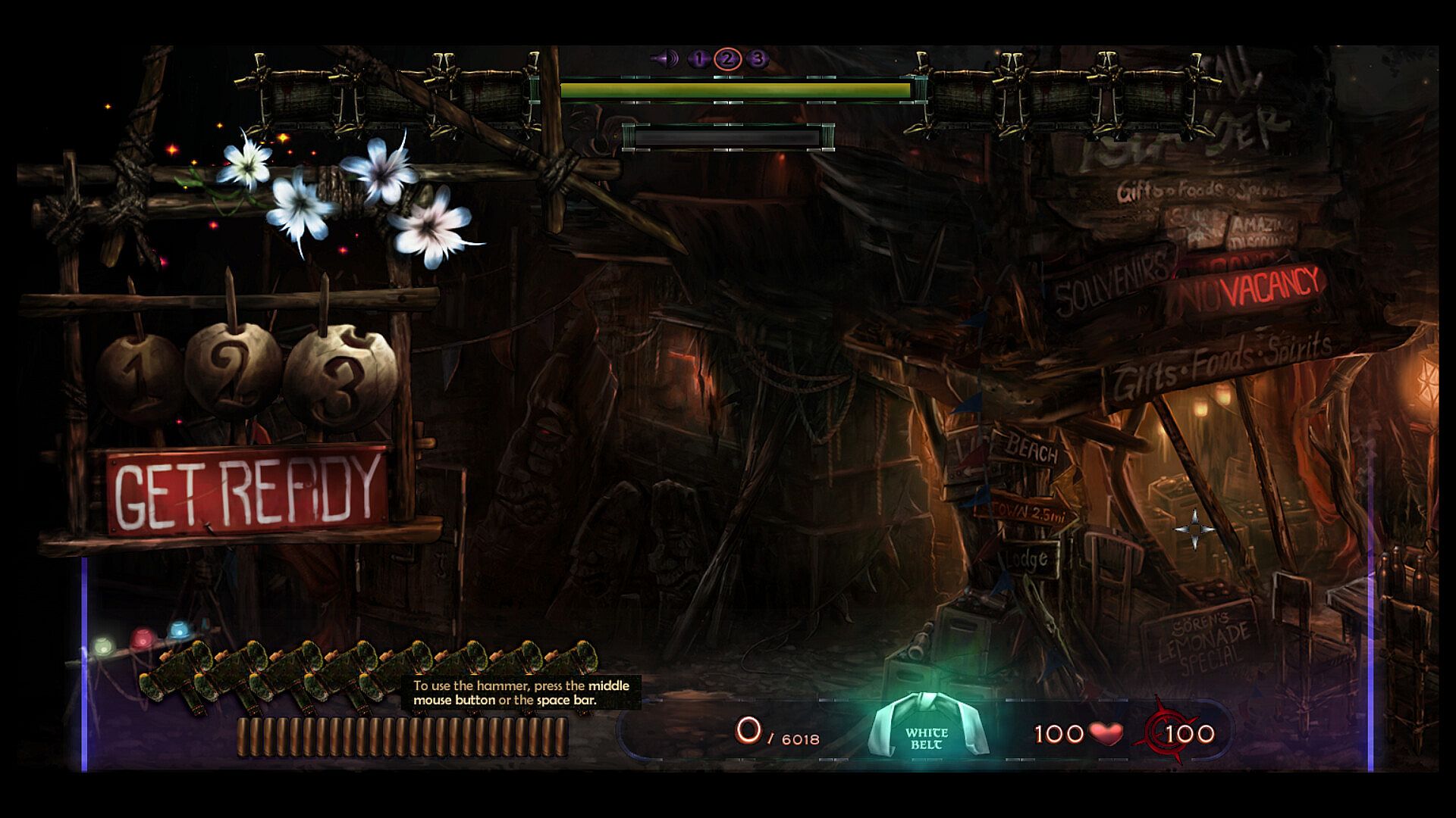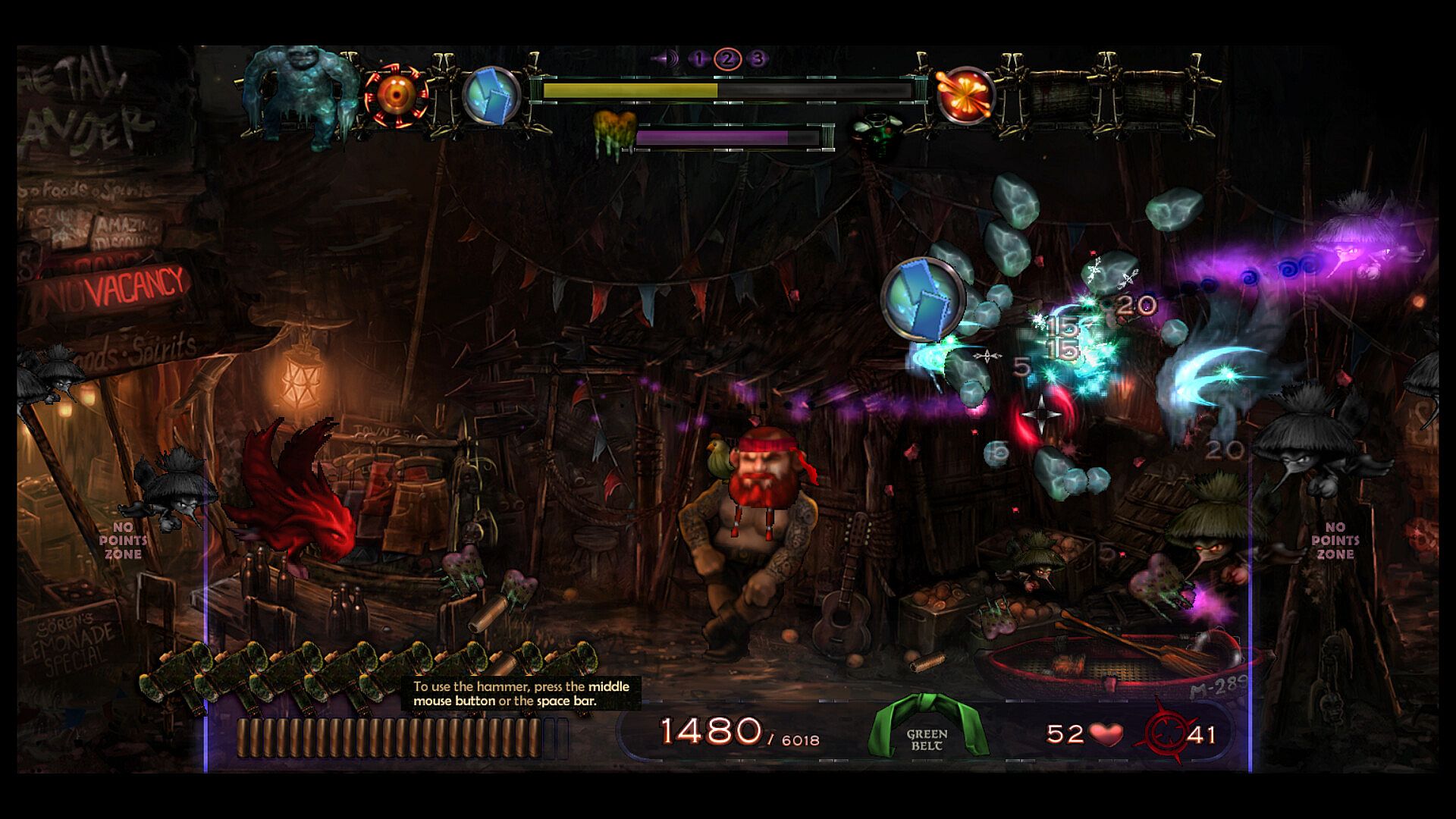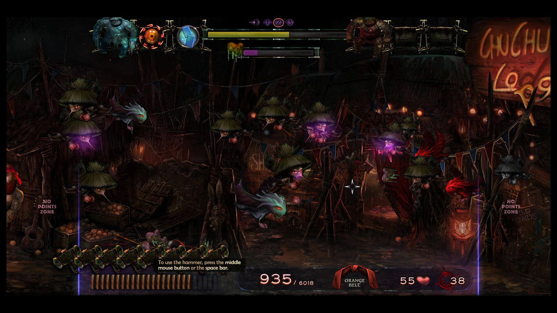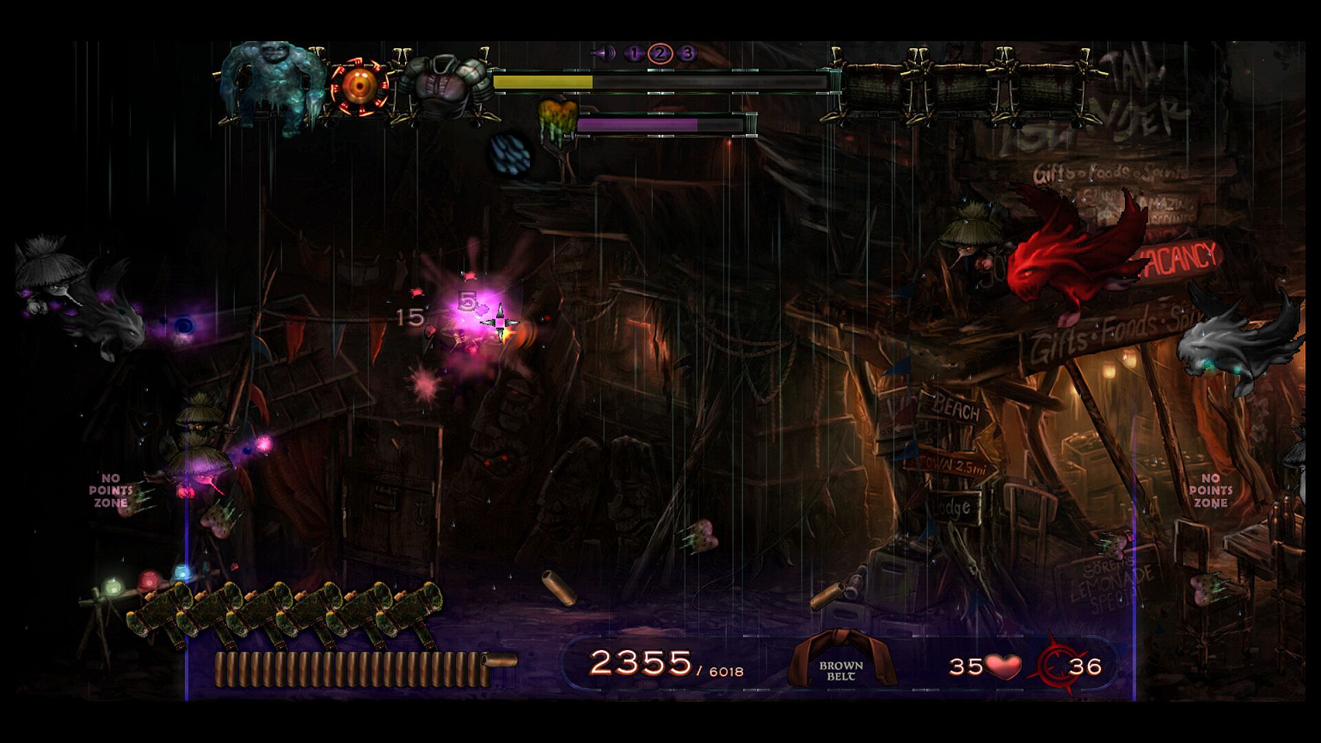 Test your reflexes and precision in this quirky hand-painted 2D shoot 'em up. The goal is to score points by shooting enemies and bonus objects within a time frame of action-packed 7 minutes plus bonus time. Climb up the high-score table and reach the rank of black belt (or maybe even one of the legendary red belts!). As the time counter progresses, your enemies are getting more aggressive and are furiously throwing dragon fire and zombie slime at you. Although you have unlimited ammo at your disposal, you are required to reload your gun regularly! Some enemies leave bonus objects in the arena after they vanish. These bonuses can be cached and stored in the inventory for strategic use or released immediately as they appear. The arsenal of bonuses include...