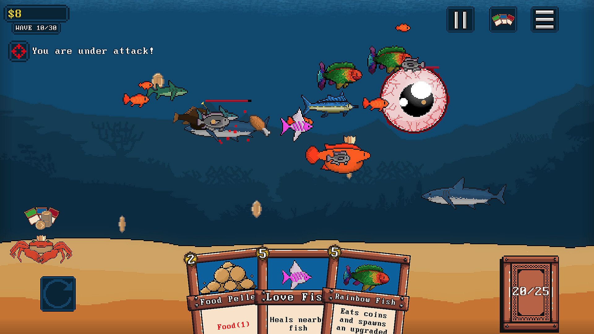 • Fight enemies with your fish army and play cards to turn the tide of battle.