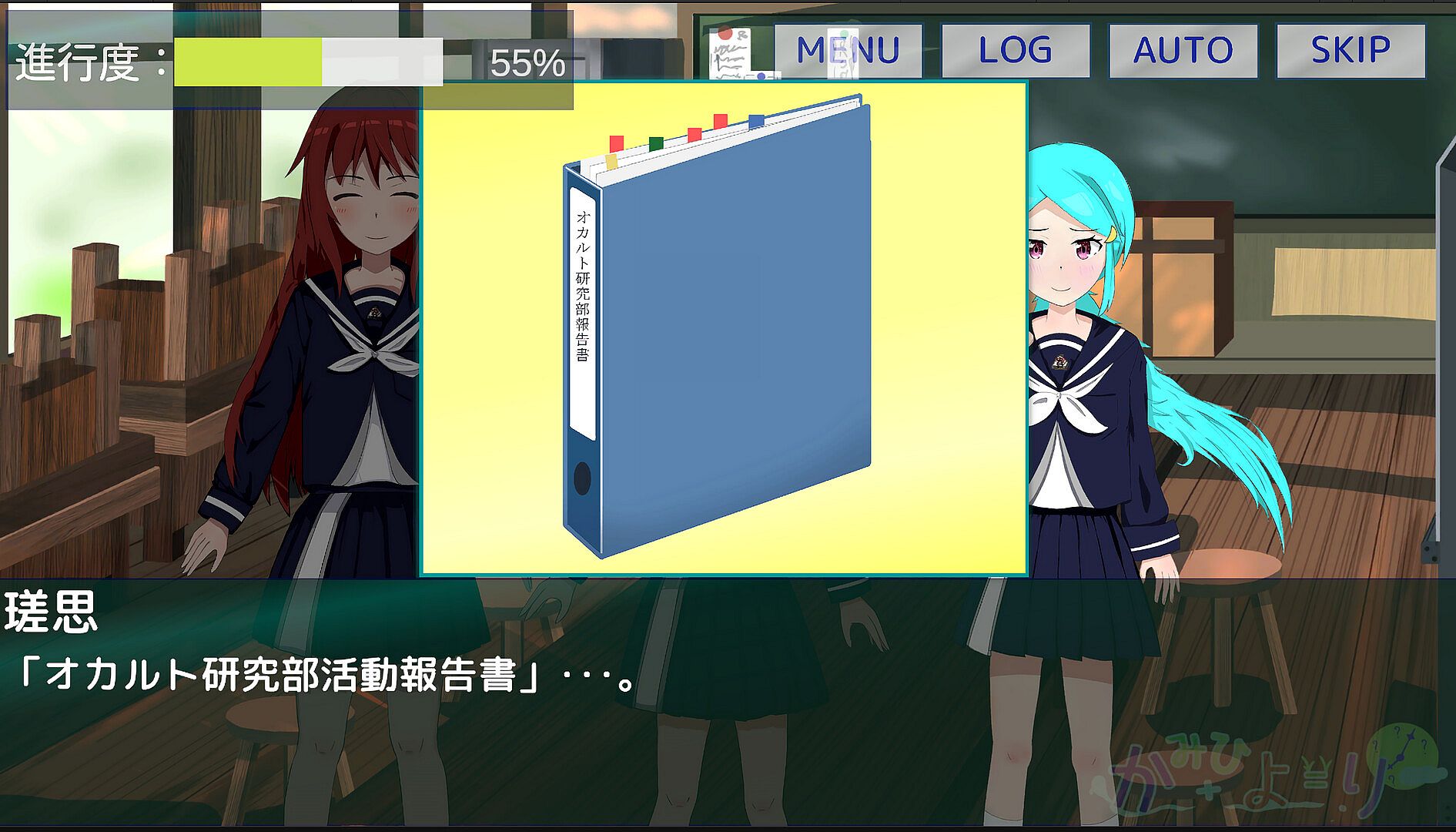 At school, she spends her days with her friends: Yui Nokata, a researcher of "Reikigaku" (Spiritualics); Manaka Taruochi, an unfortunate girl who tends to attract spirits; and Naoko Makita, an information specialist obsessed with gathering data. By a strange turn of events, the topic of the "Occult Research Club" comes up.