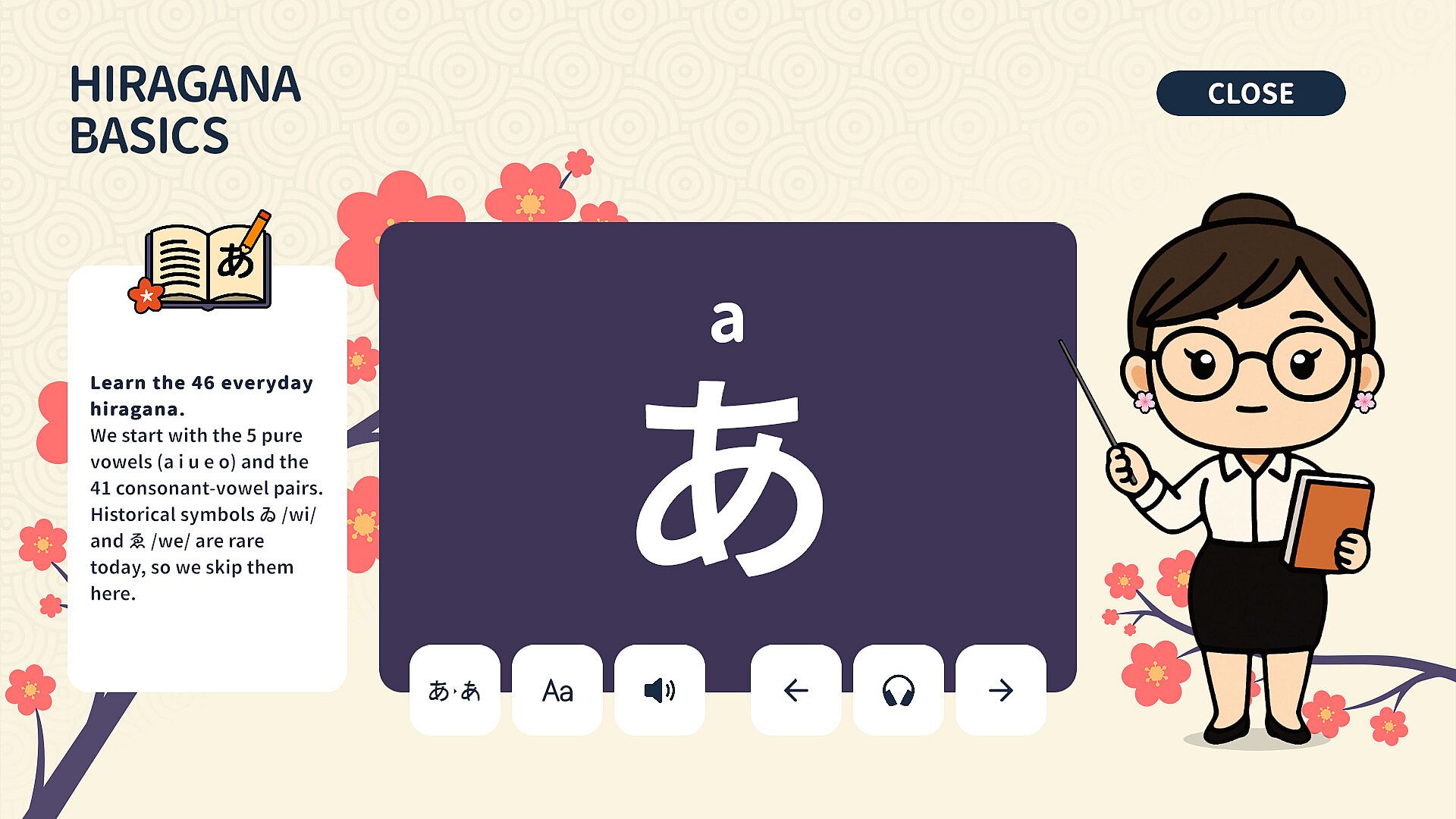 Each kana is introduced with sound, supported by examples and reading quizzes you can replay at your own pace.