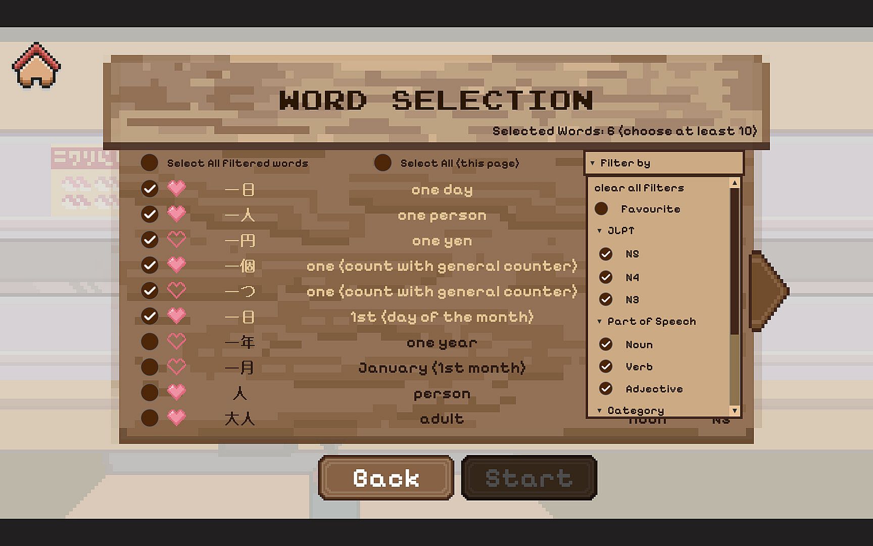 Customize your kanji and vocabulary list to focus on what you want to learn, review, or reinforce. You can shape your own study plan with filters for topics, JLPT levels, or parts of speech and progress at your own pace.
