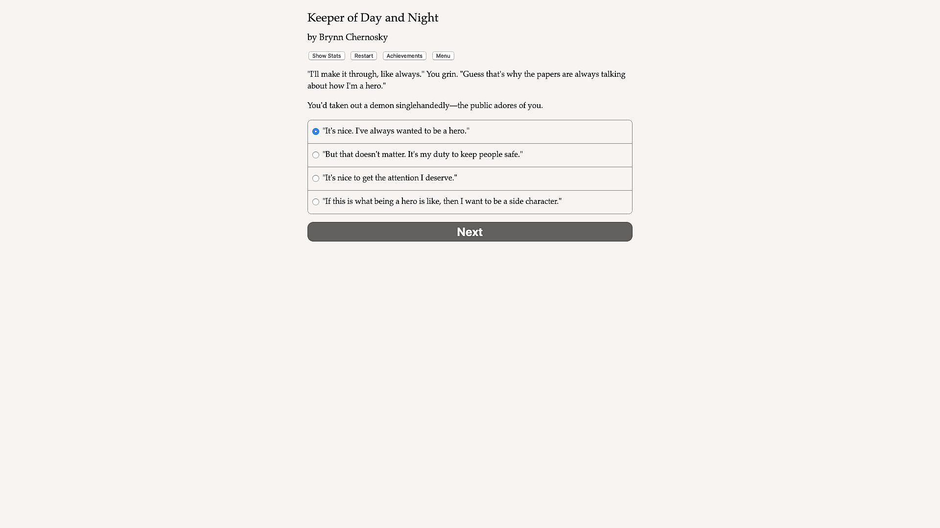 Keeper of Day and Night is a 390,000 word interactive urban fantasy novel by Brynn Chernosky, where your choices control the story. It’s entirely text-based—without graphics or sound effects—and fueled by the vast, unstoppable power of your imagination.