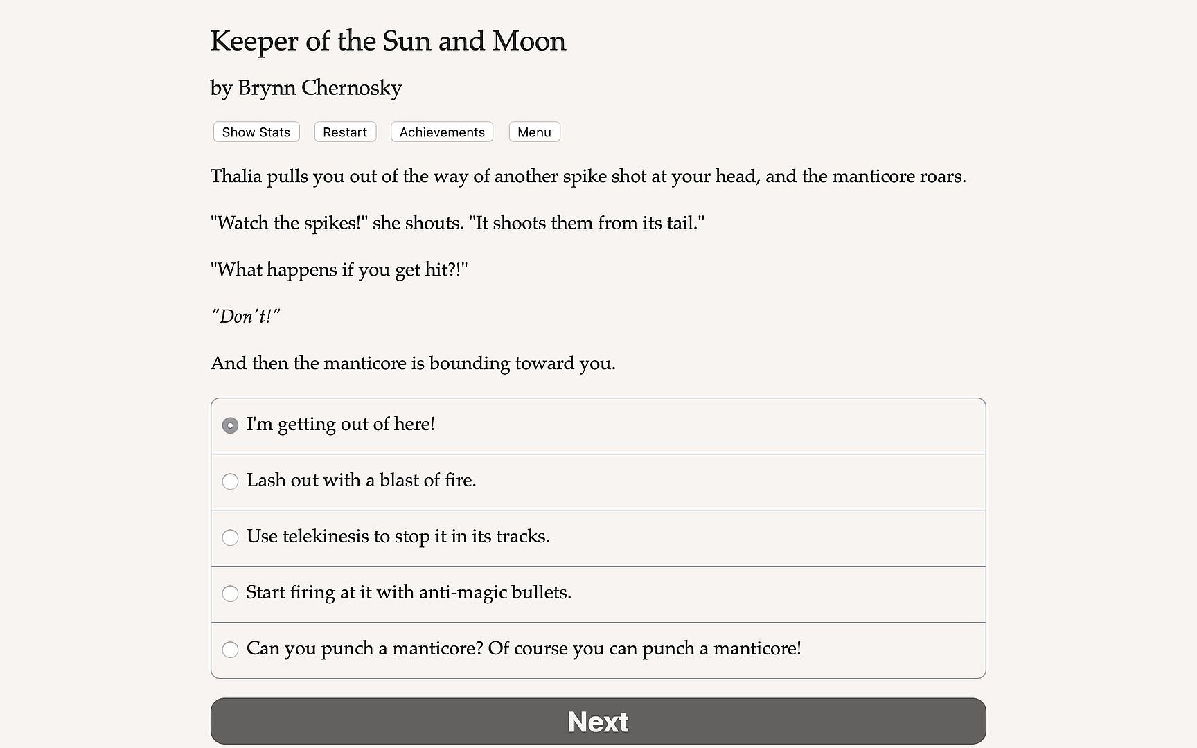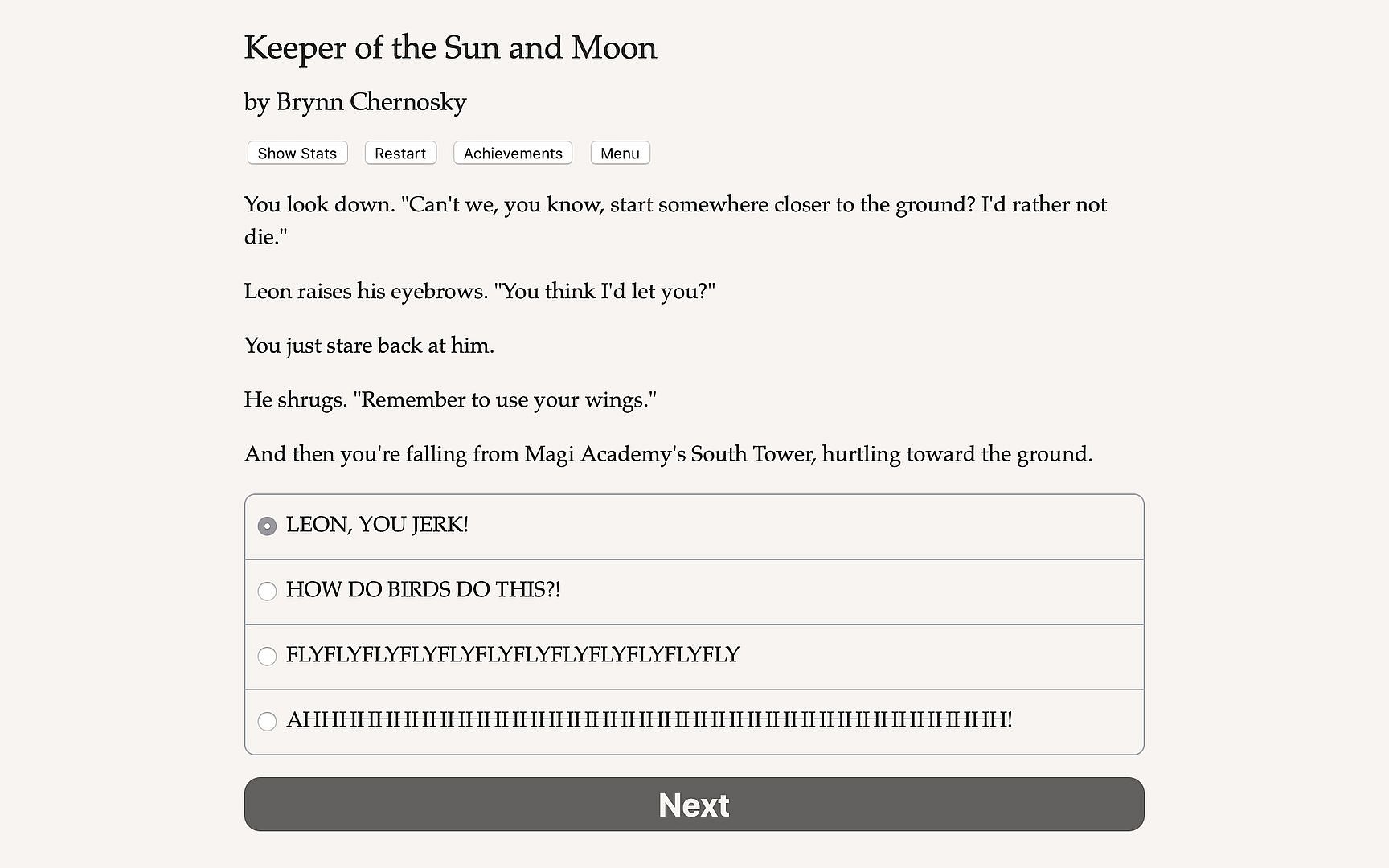 Keeper of the Sun and Moon is a 310,000 word interactive fantasy novel by Brynn Chernosky, where your choices control the story. It’s entirely text-based—without graphics or sound effects—and fueled by the vast, unstoppable power of your imagination.