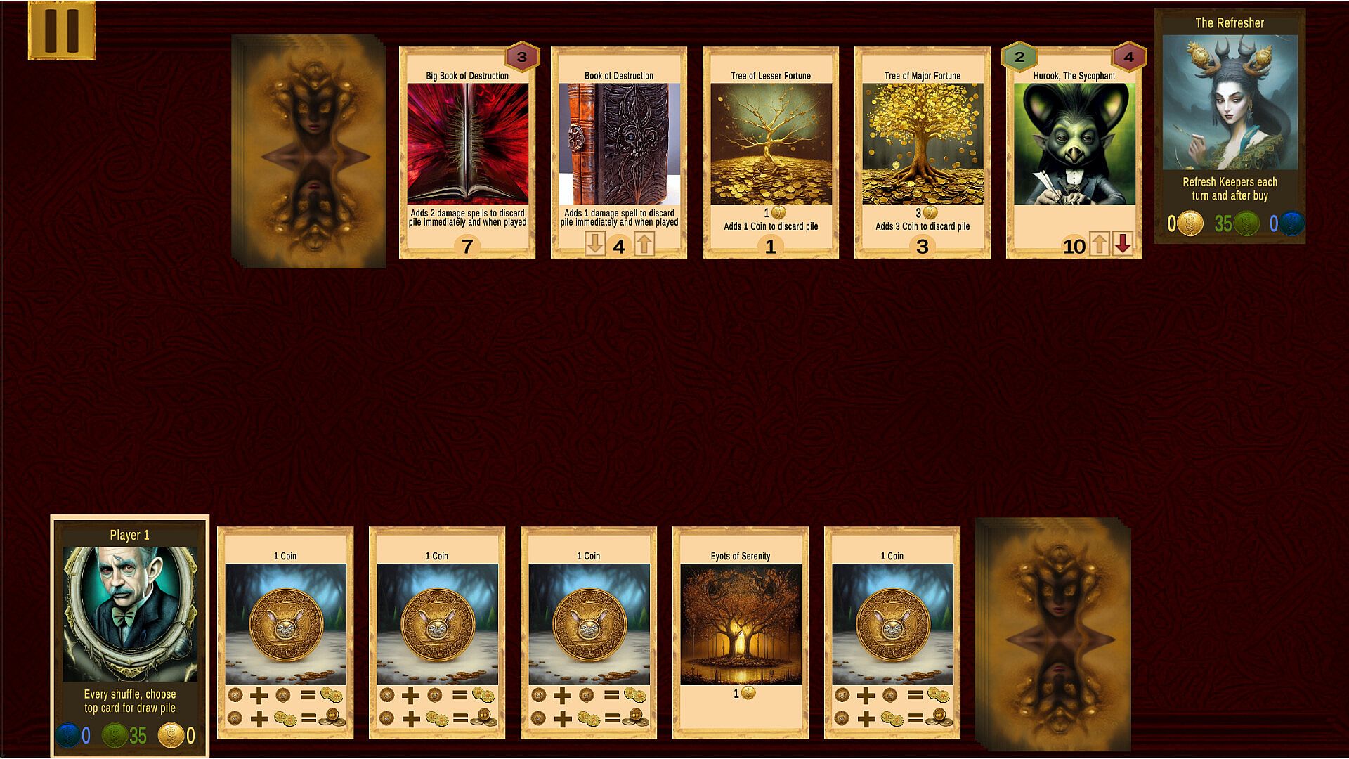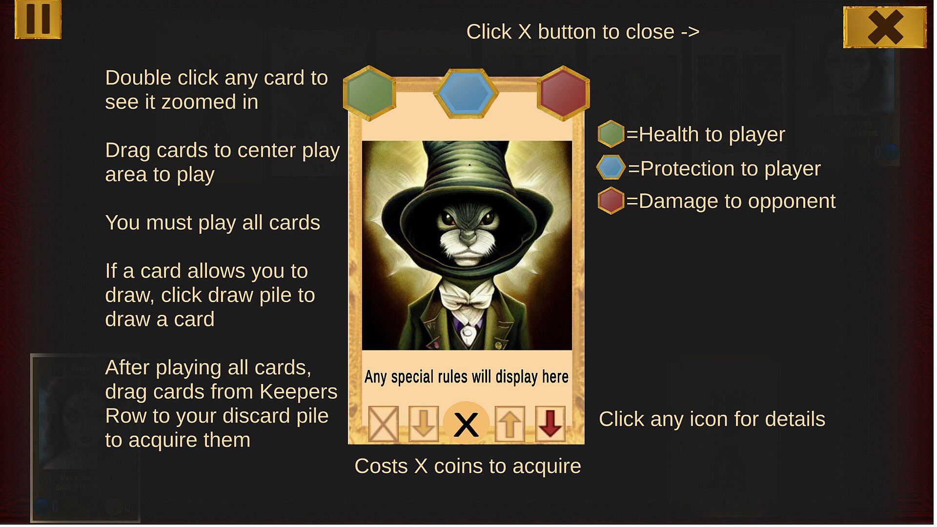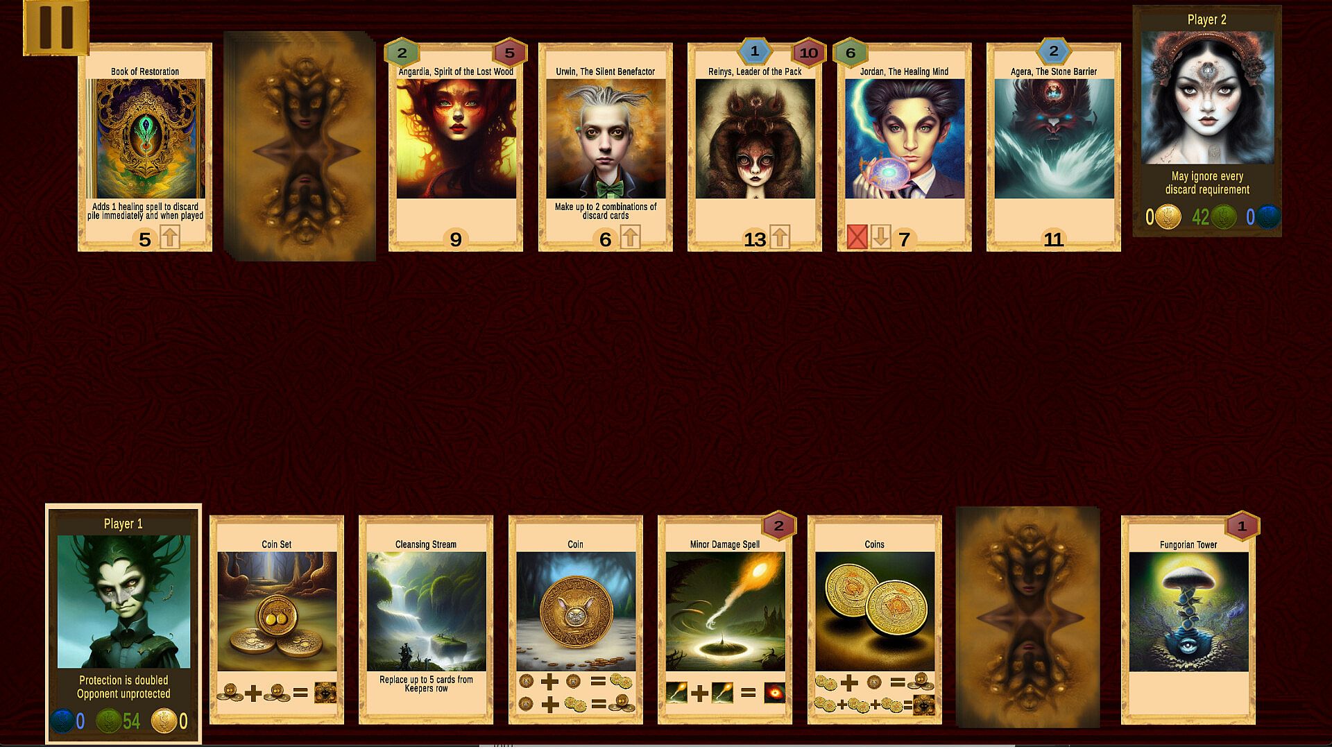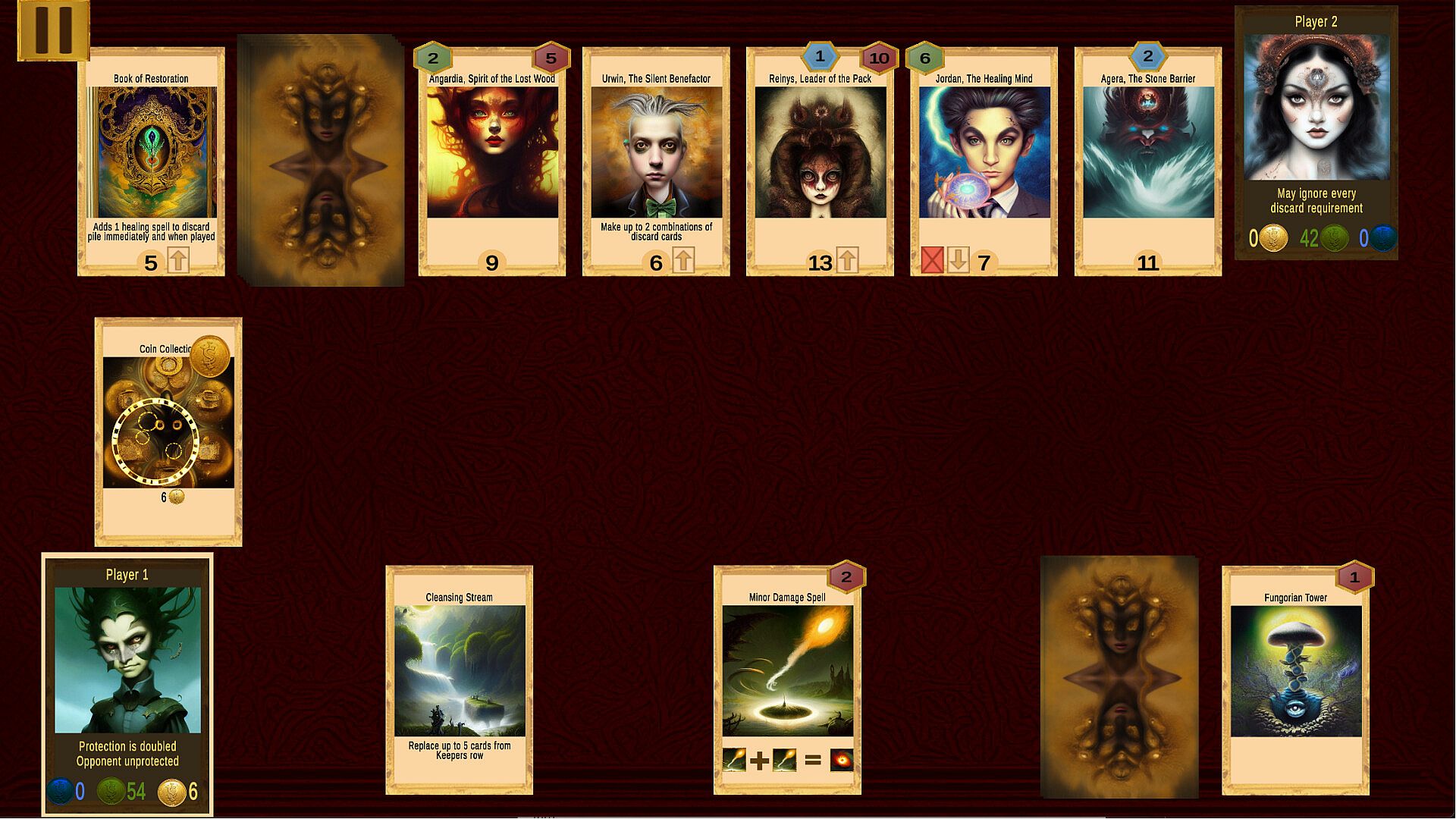 Each player starts with the same 10 starter cards. Use the coins you draw into your hand to acquire new cards from the Keepers Row. Each card may give you health, damage, protection, more coins, or a combination of these. There are also many Keepers you can acquire that will allow you to do special things (written on each card). Some special rules include refreshing the keepers row - discarding up to all 5 of the drawn keepers and drawing new ones from the deck into the keepers row, combining cards in your discard pile, or immediately gaining spells into your discard pile. Cards may also require you to discard, or may allow you to draw an extra card, or even make your opponent discard a card (these are denoted as icons on the bottom of each card).