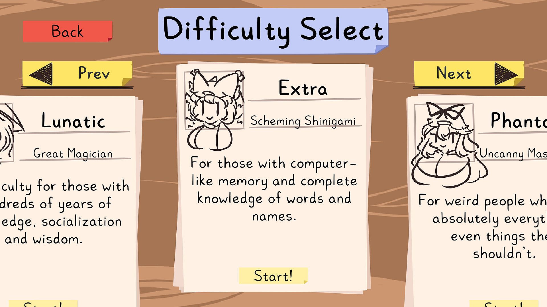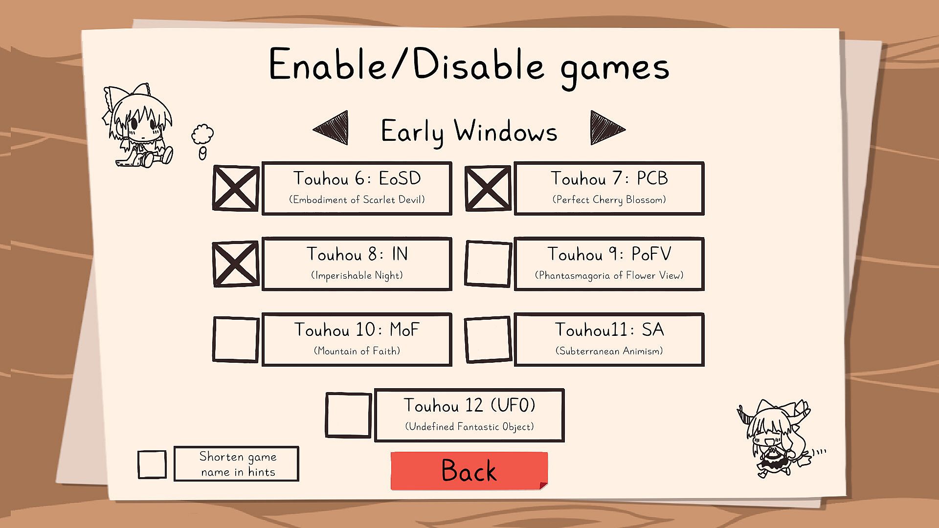• A game for Touhou fans of all levels and non-Touhou fans alike! Customize the word pool by picking your favorite games so familiar Touhou characters, songs and locations appear as words, or just test your knowledge of real English words! Make your own playlist of words to keep the game fair and fresh!