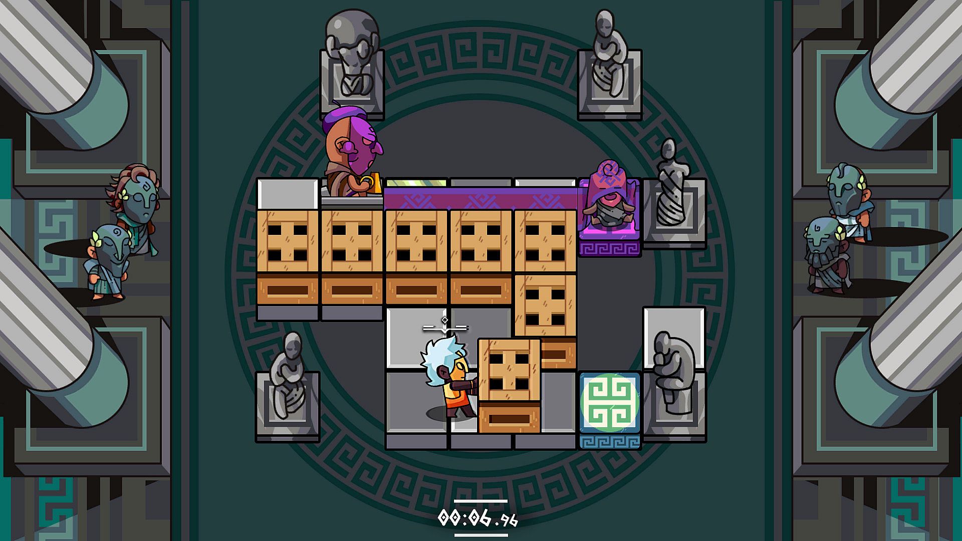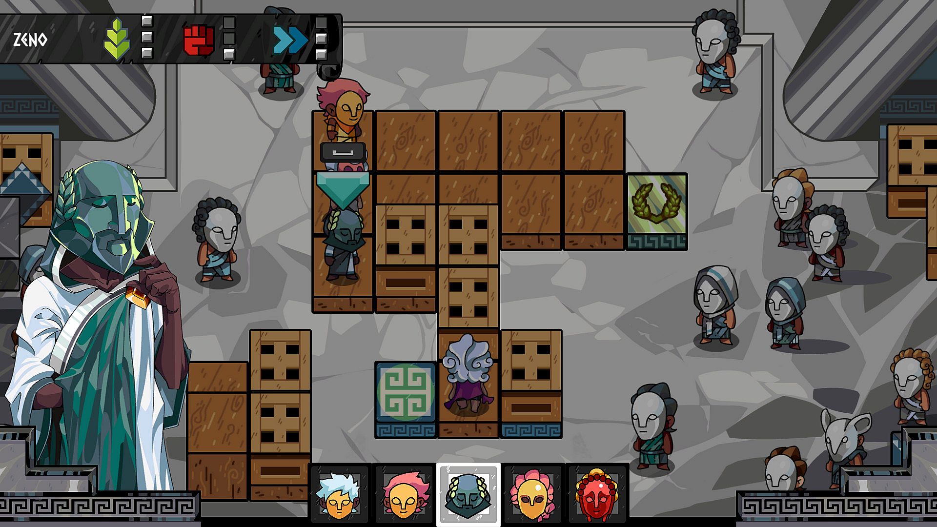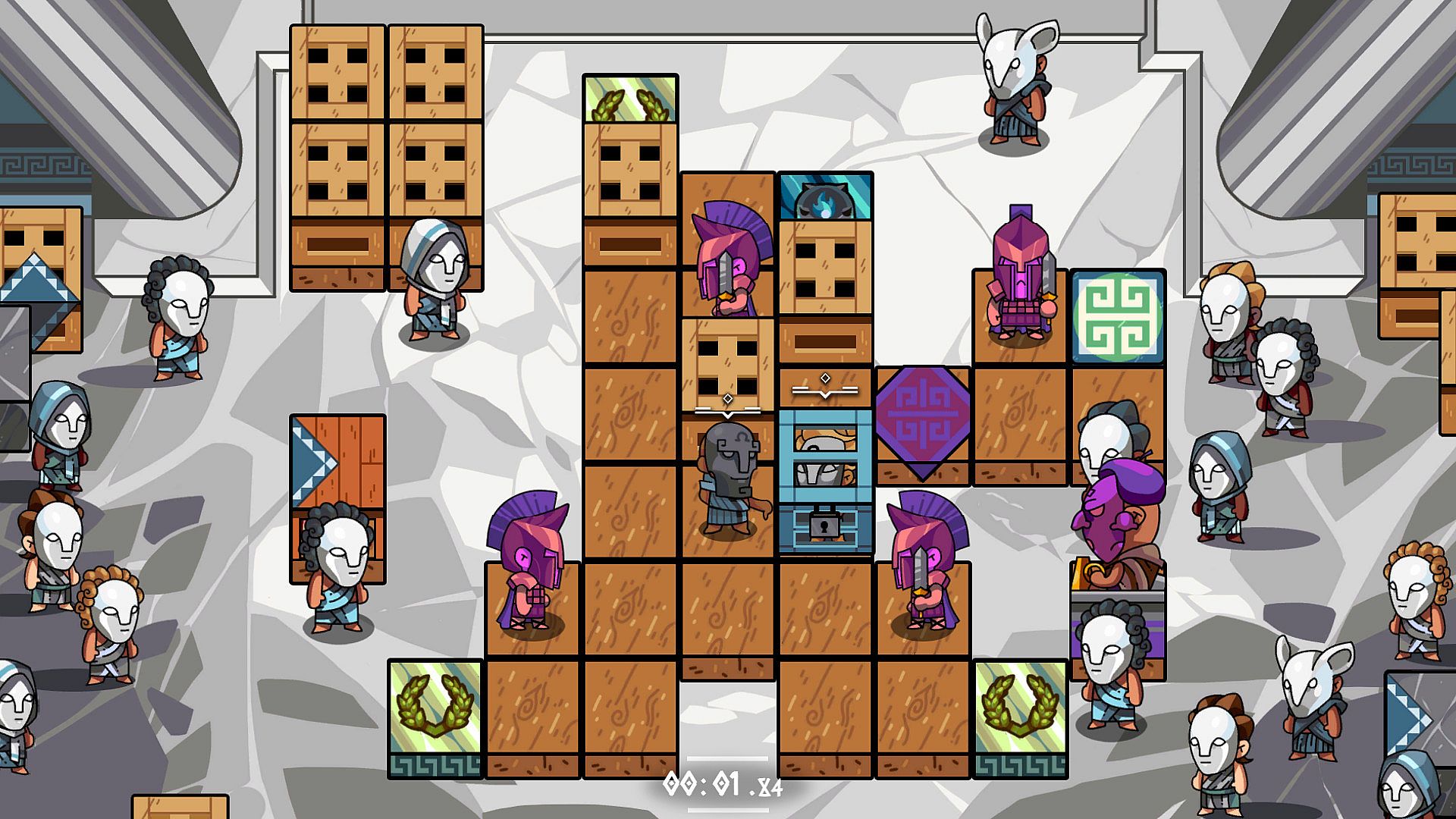 In this Sokoban style puzzle game you play as a cast of actors seeking the main role! To do so they must reach the choir podium moving different kinds of objets blocking their path while avoiding enemy actors who want to reach the podium before you. Try not to pass through forbbiden places, using mechanisms, confronting soldiers, prisoners, minotaurs and more.
