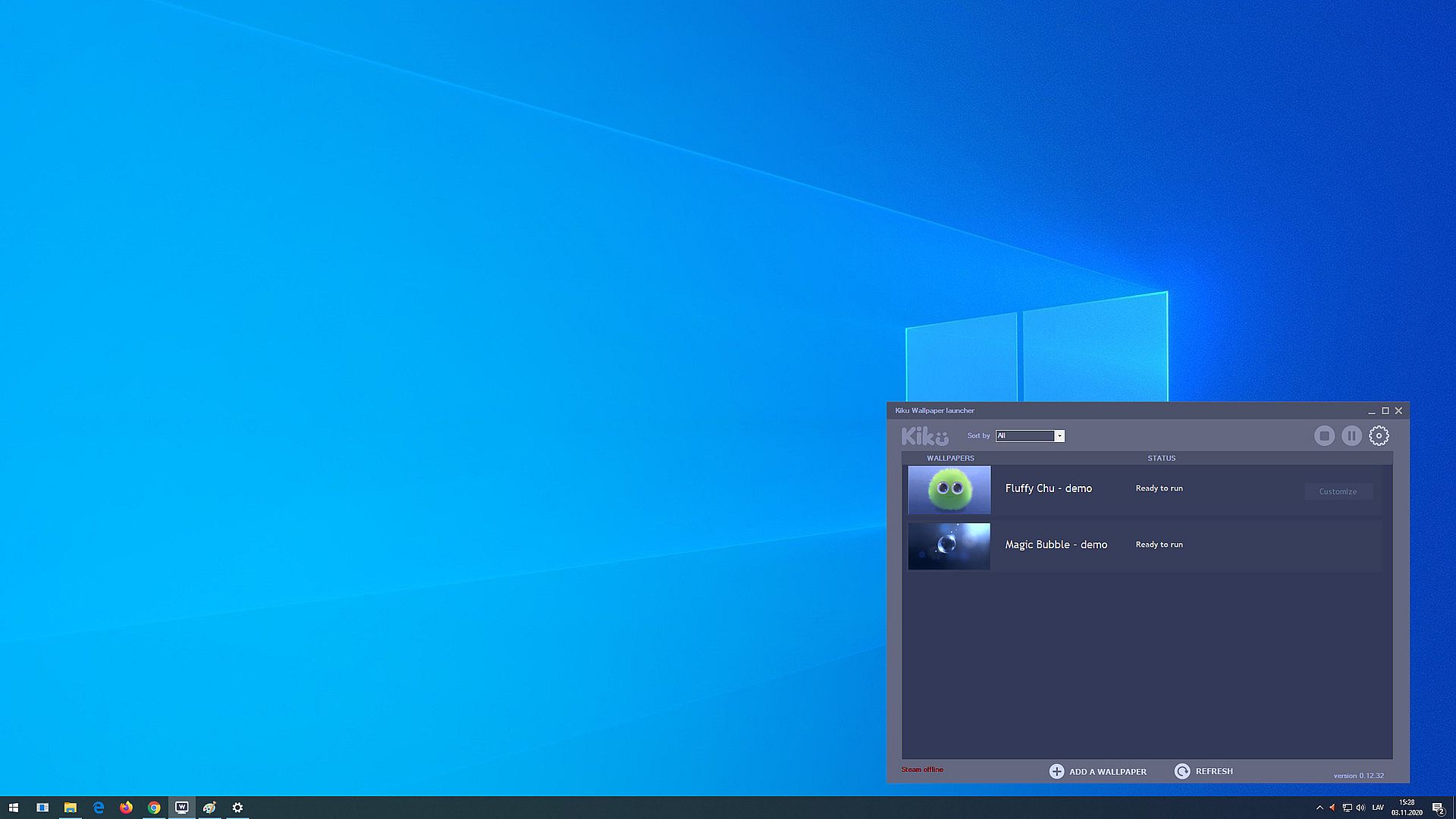 With a Kiku Wallpaper Launcher, you can run desktop live wallpapers. NOTICE! Kiku Wallpaper Launcher supports specialized desktop live wallpapers only; it does not support custom-made live wallpapers or any other type of media. Additional live wallpapers will be available as a DLC.