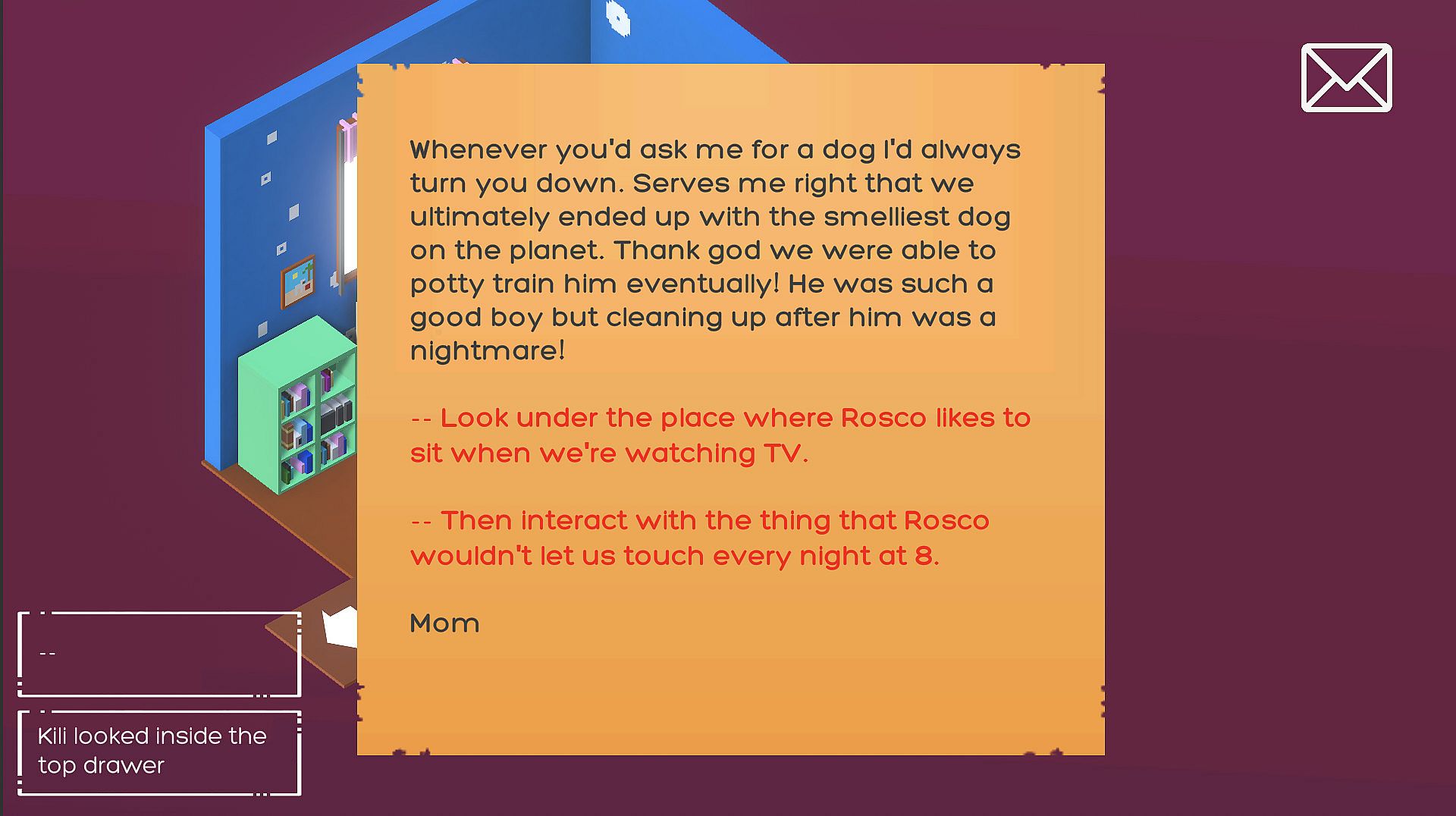 Help Kili search her house for treasure hidden by her mother in this indie treasure hunt game. Interact with dozens of objects across six rooms to uncover clues. Read Mom's hints with care to piece together the path forward. Follow more than 30 clues through over 45 meaningful items, each tied to the unfolding tale. Relive moments between a girl and her best friend in a compact, heartfelt story. Players who enjoy thoughtful exploration and puzzle-solving in cozy home settings will find a quick, satisfying challenge on PC.